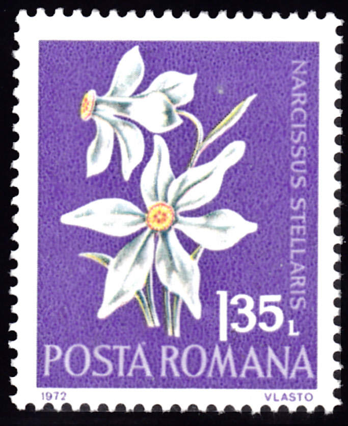 Auf dieser Marke aus Rumänien (MiNr 3027) sind zwei Stern-Narzissen (Narcissus radiiflorus) der Unterart Narcissus radiiflorus var. stellaris zu sehen.