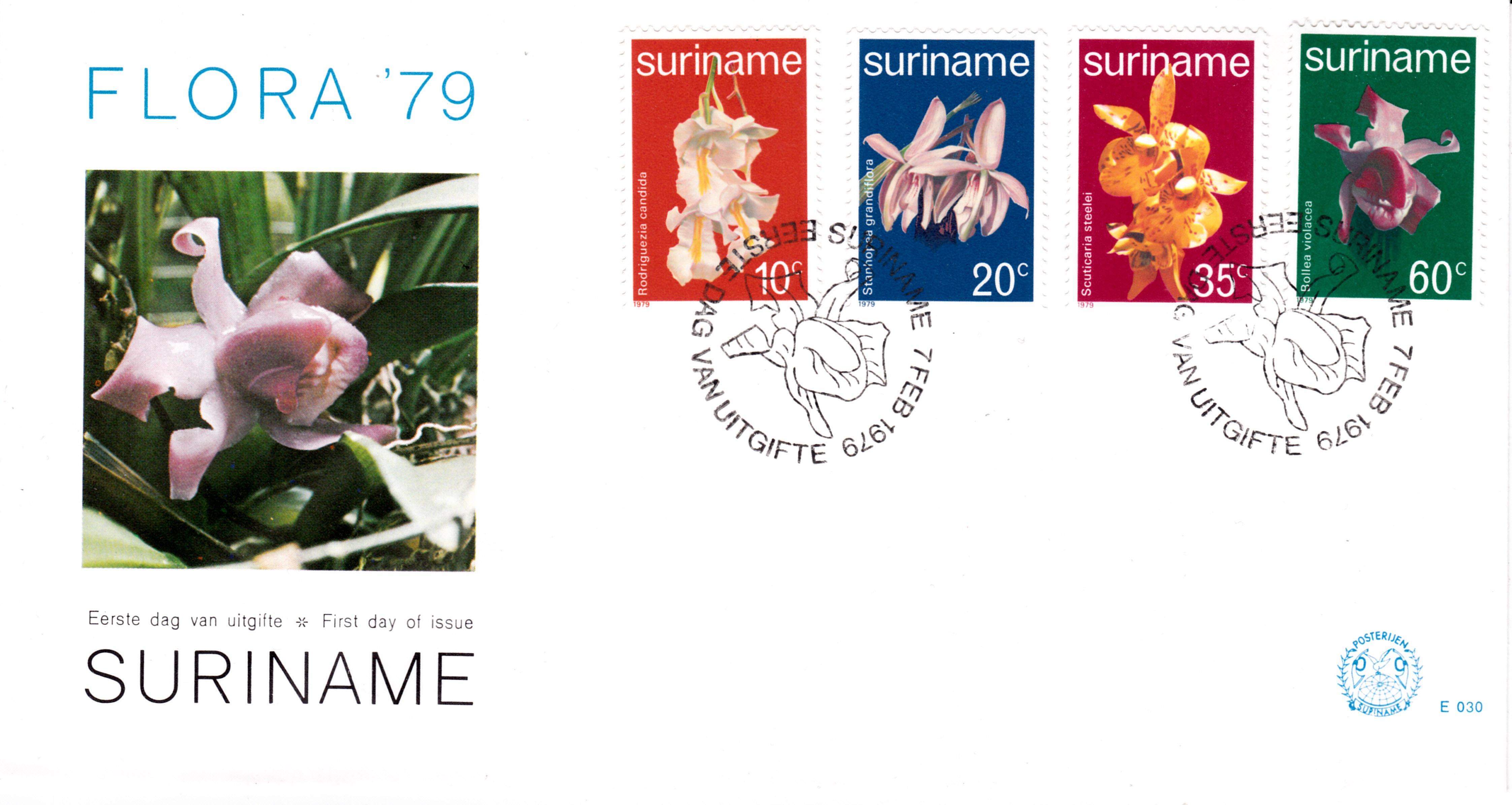FDC mit allen vier Marken dieser Serie "Orchideen" aus Surinam und dem Ersttagsonderstempel.