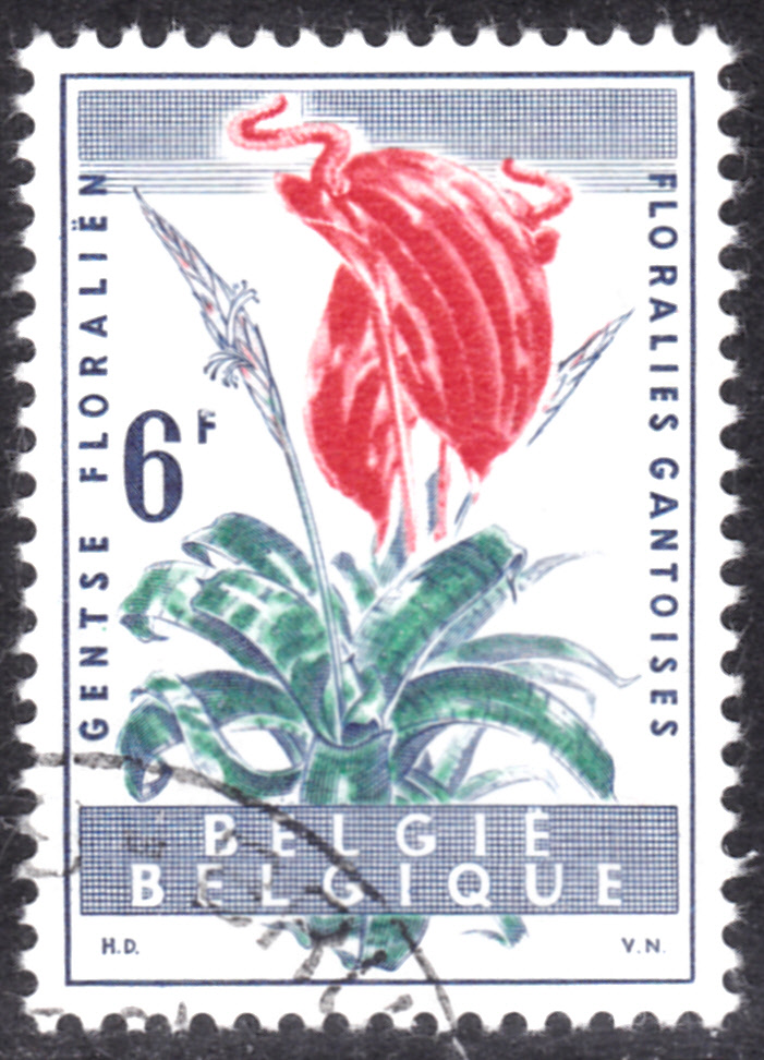 Diese Marke aus Belgien (MiNr 1181) zur Genter Blumenschau 1960 zeigt auch eine Kleine Flamingoblume (Anthurium scherzerianum). Es ist die hintere Pflanze, vorne wird noch eine Bromelia agavifolia gezeigt.