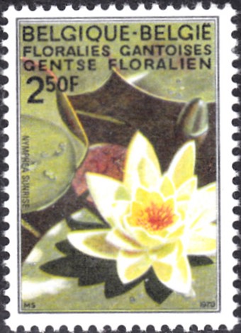 Auf dieser Marke (MiNr 1581 I) aus einer belgischen Serie zur Genter Blumenschau 1970 wird eine Blüte der Seerose Nymphaea "Sunrise" gezeigt.