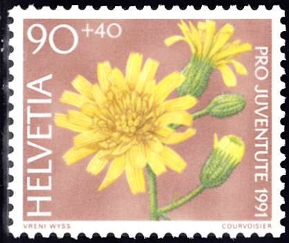Auf dieser Marke aus der Schweiz (MiNr 1458) sind Blüten des Wald-Habichtskraut (Hieracium murorum) abgebildet.