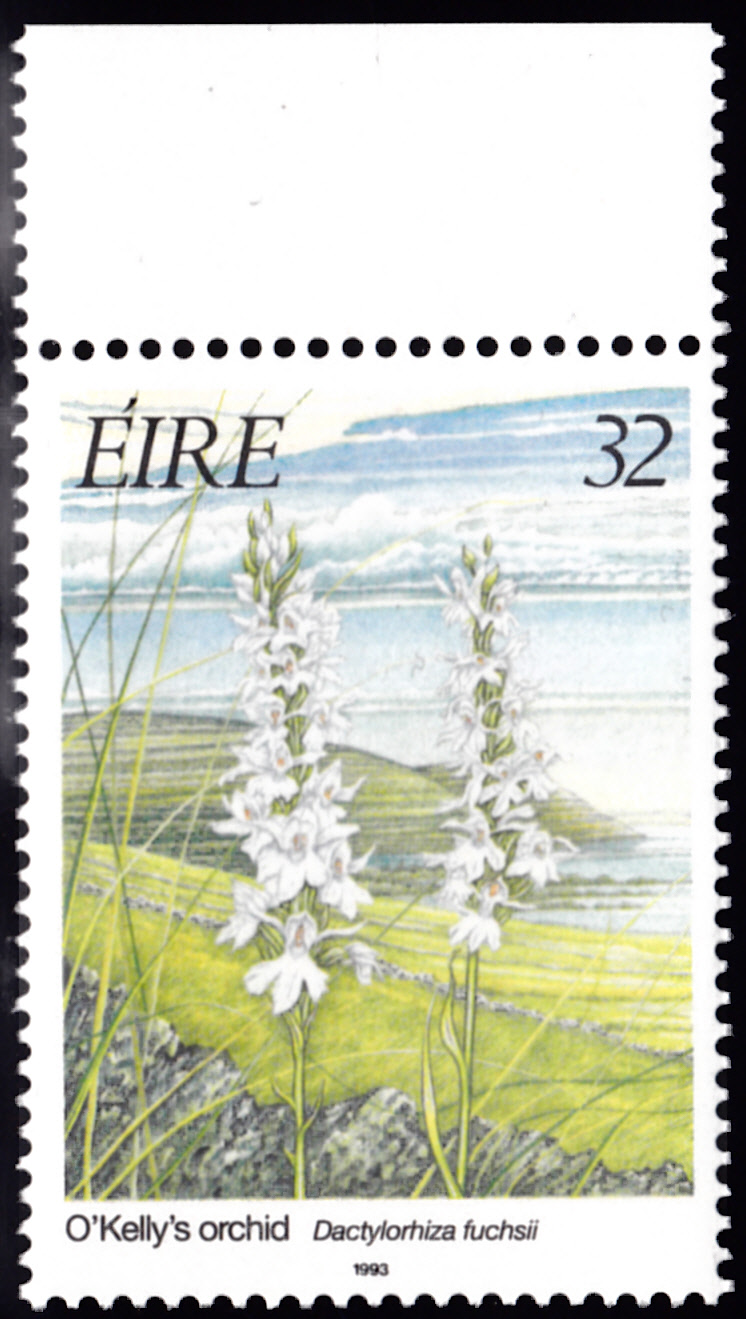 Auf dieser Marke aus Irland (MiNr 822) wird die Unterart Dactylorhiza fuchsii subsp. okellyi (Druce) Soó gezeigt: Sie kommt im westlichen Großbritannien und im westlichen Irland vor. Im Michel und auf der Marke wird als Name O´Kelly-Orchidee (Dactylorhiza fuchsii) genannt.