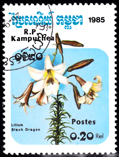 Diese Marke aus Kambodscha zeigt eine Zuchtform mit dem Namen Lilium "Black Dragon".