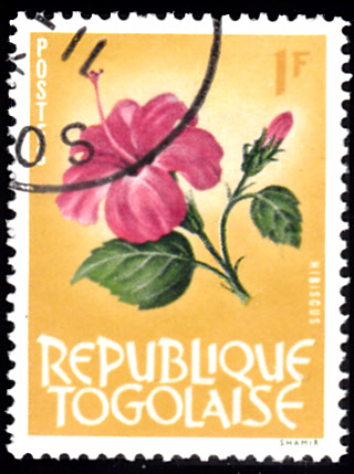 In einer Serien "Blumen und Tiere" aus Togo zeigt eine Marke (MiNr 386) Hibiskusblüten.