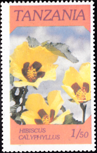 Diese Marke aus Tansania (MiNr 324) zeigt Blüten des Gelben Hibiskus (Hibiscus calyphyllus).