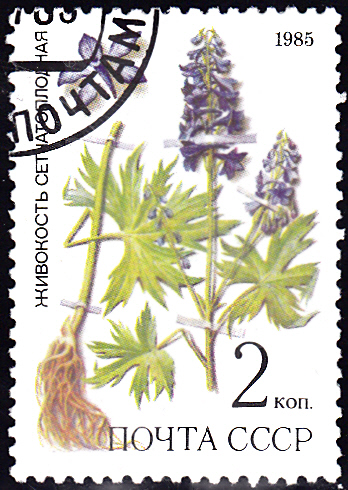 Aus einer Serie "Geschützte Heilpflanzen Sibiriens" aus der Sowjetunion kommt diese Marke (MiNr 5528) kommt diese Marke mit Rittersporn der Art Delphinium dictyocarpum.