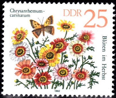 Aus einer Serie "Herbstblumen" der DDR kommt diese Marke (MiNr 2741) mit Bunten Wucherblumen (Ismelia carinata).