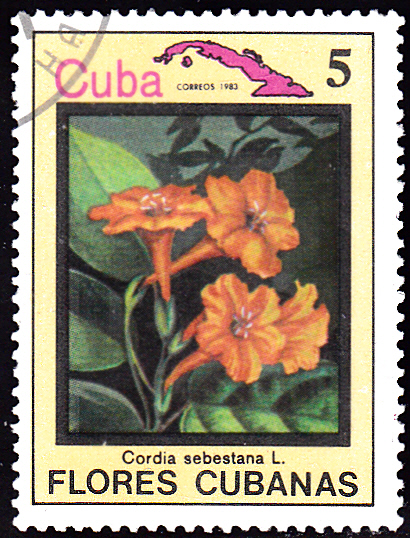 Auf dieser Marke aus Äquatorial-Guinea (MiNr 911) sehen wir Blüten einer Gelben Cordia (Coria lutea).