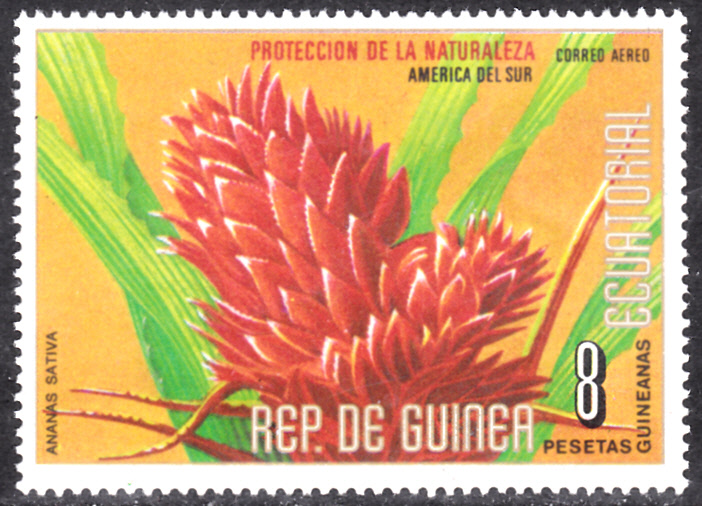 Auf dieser Marke aus Äquatorial-Guinea (MiNr 916) sehen wir den Blütenstand einer (Ananas comosus oder Ananas sativus).