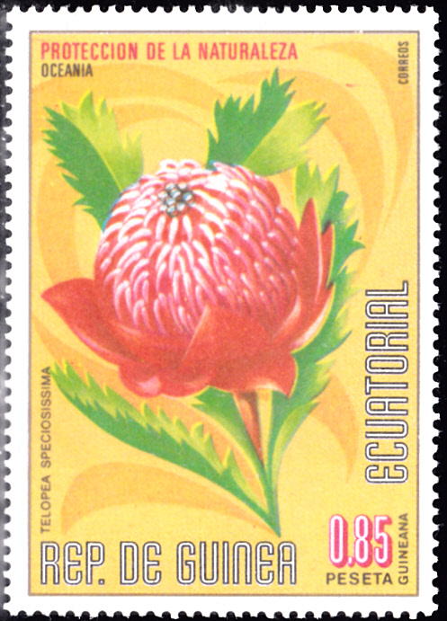 Auf dieser Marke aus Äquatorial-Guinea (MiNr 921) ist eine Blüte von Telopea speciosissima abgebildet.