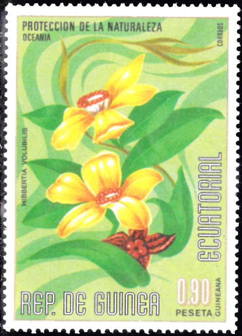 Auf dieser Marke aus Äquatorial-Guinea (MiNr 922) ist blühender Goldwein (Hibbertia scandens) abgebildet.
