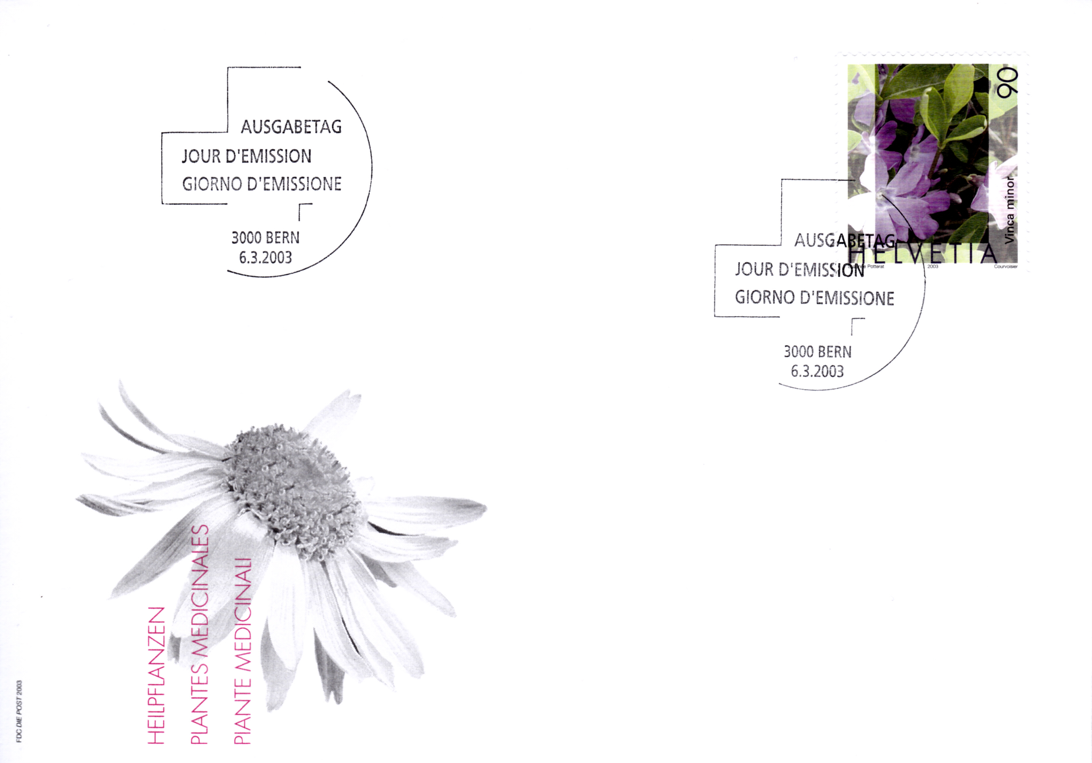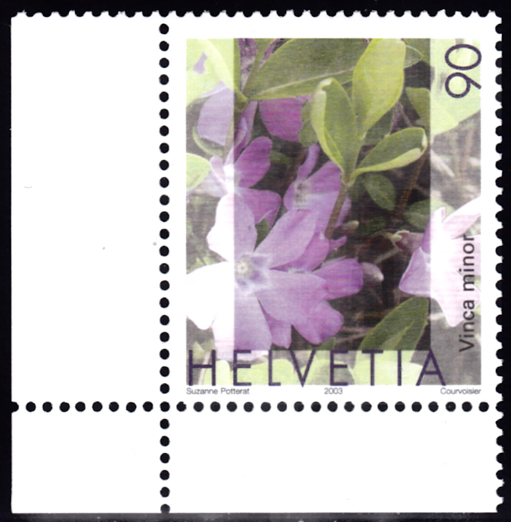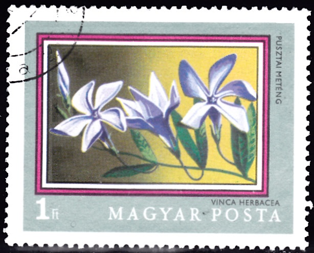 Auf dieser Marke aus Ungarn (MiNr 2698) sehen wir Blüten des Krautigen Immergrün (Vinca herbacea).