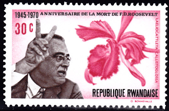 Diese Marke aus Ruanda (MiNr 423 A) bildet auf der linken Seite eine Laeliocattleya Callistoglossa ab.