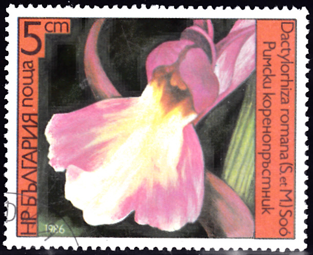 Aus Bulgarien kommt diese Marke (MiNr 3441) mit einer Blüte des Römischen Knabenkraut (Dactylorhiza romana).