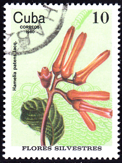 Auf einer Marke aus Kuba (MiNr 2521) können wir Blüten des Hamelia patens sehen.