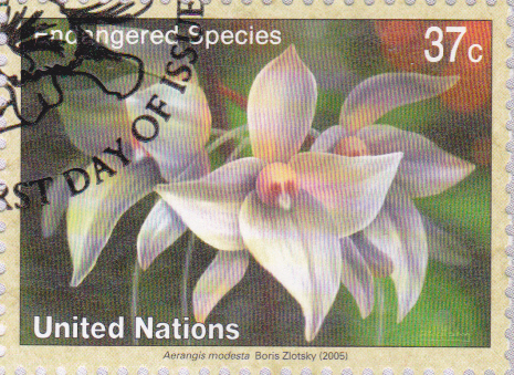 Bei der UNO Postverwaltung New York ist in einer Ausgabe "Gefährdete Arten" eine Marke (MiNr 976) mit der Blüte einer Aerangis modesta.