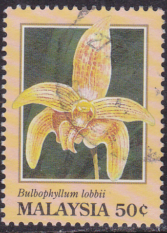 Diese Marke aus Malaysia (MiNr 515) zeigt die Blüte einer Bulbophyllum lobbii.