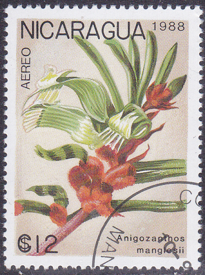 Auf einer Marke aus Nicaragua werden Blüten einer Anigozanthos manglesii gezeigt.