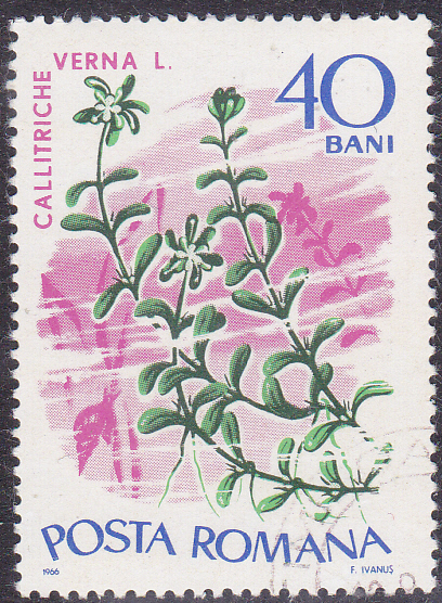 Einer Marke aus Rumänien (MiNr 2528) stellt uns einen Sumpf-Wasserstern (Callitriche palustris) vor. Michel nennt den Namen Frühlings-Wasserstern (Callitriche verna).