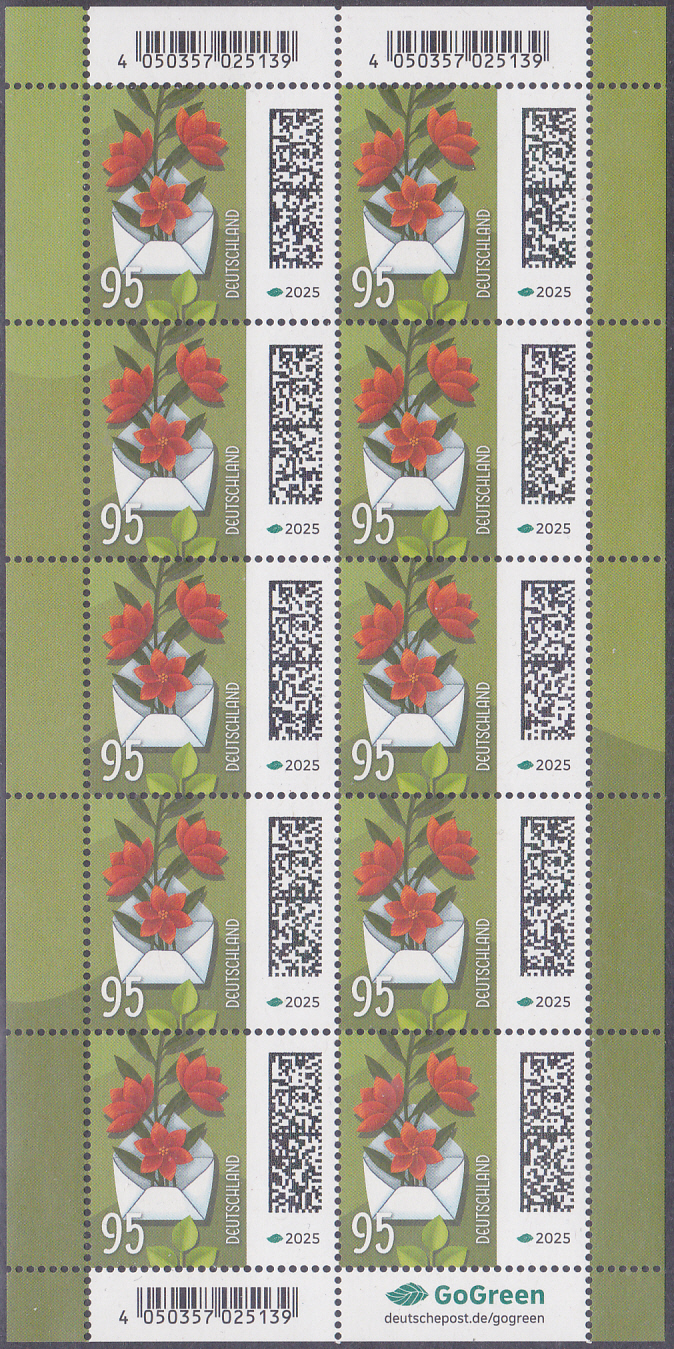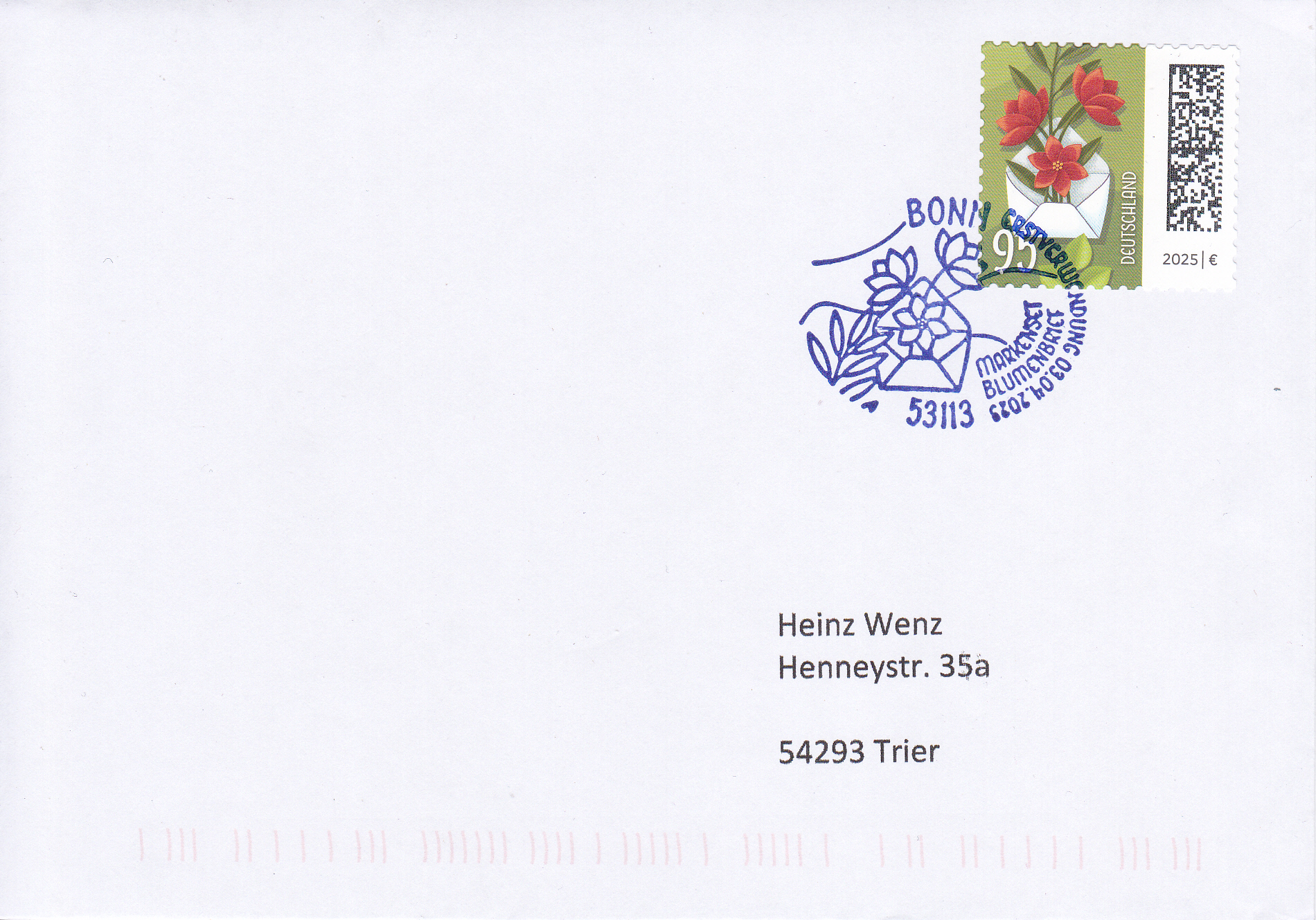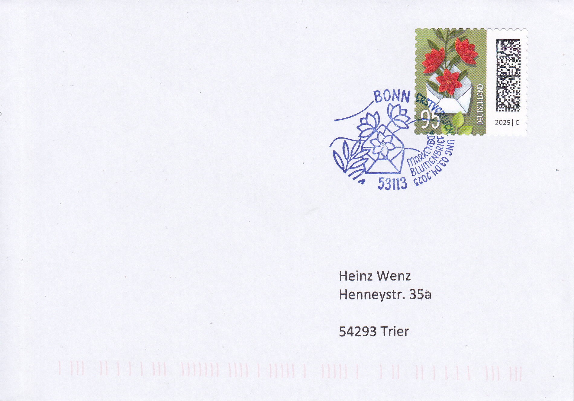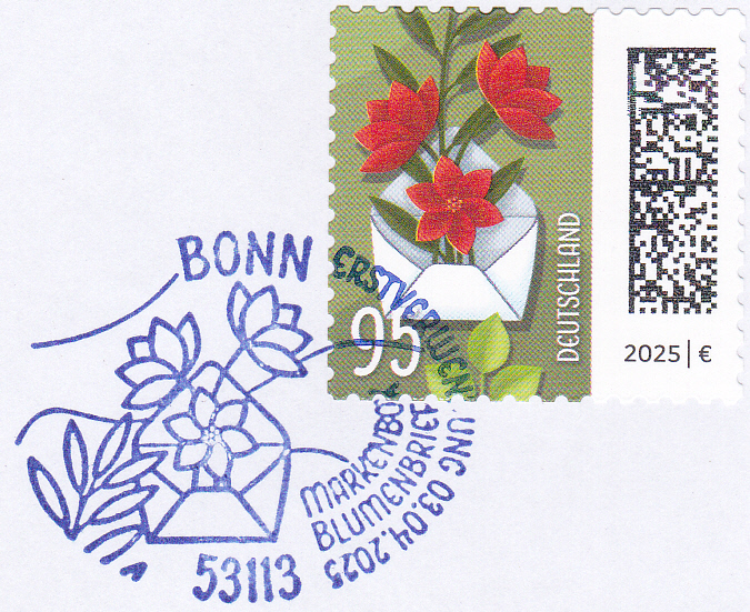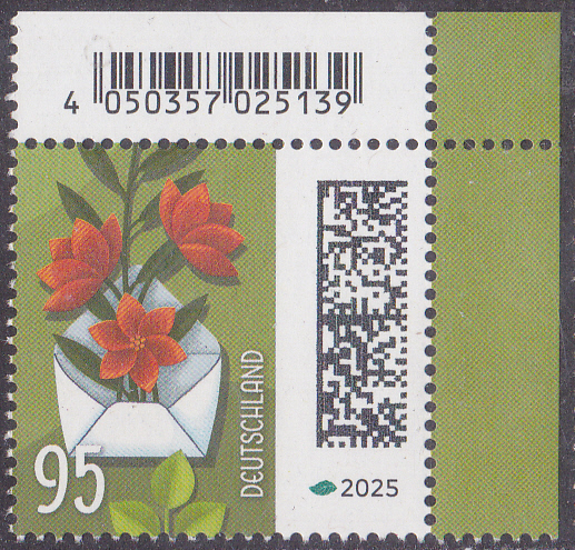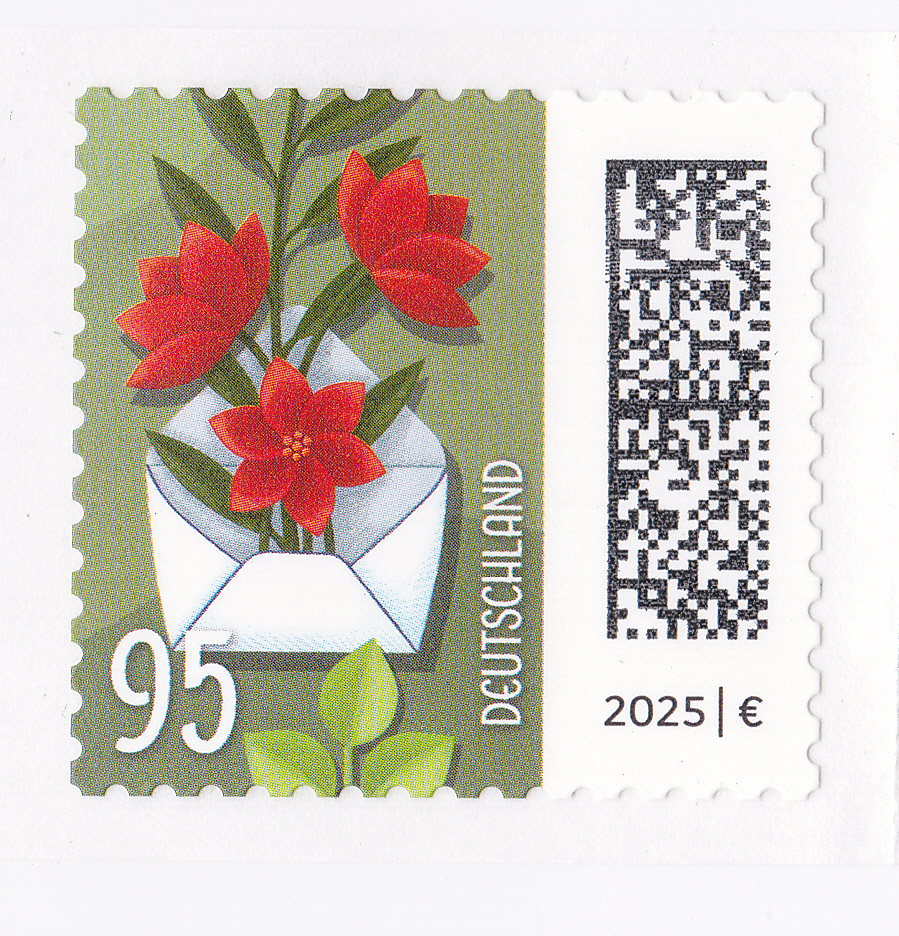 Eine Marke zu 95 Cent (MiNr 3898) aus der Dauerserie "Welt der Briefe" der Deutschen Post zeigt die Abbildung "Briefumschlag mit orangefarbenem Milchstern (Ornithogalum dubium)".