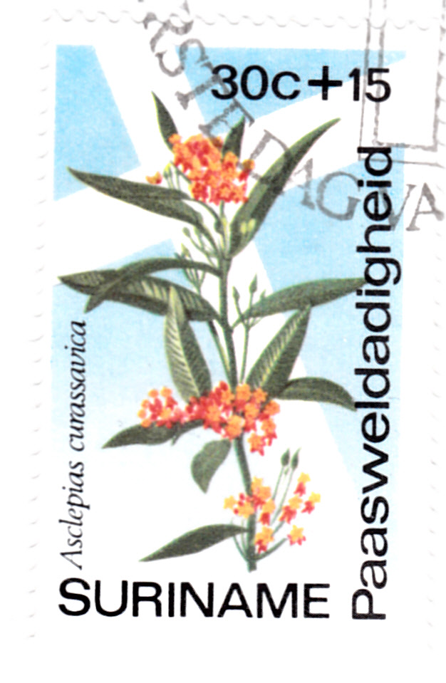 Auch auf dieser Marke aus Surinam (MiNr 670) wird die Blüte einer Indianer-Seidenpflanze (Asclepias curassavica) gezeigt. Bei Michel wird der Name Brechwurz (Asclepias curassavica) verwendet.