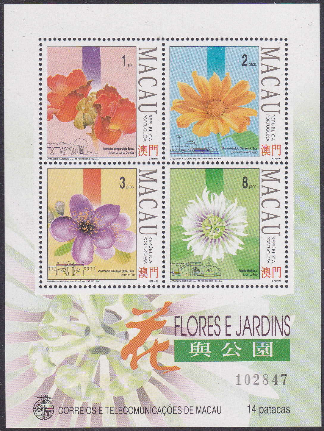 Auf dieser Marke aus Macau (MiNr 737) wird die Blüte einer Falsche Myrte (Rhodomyrtus tomentosa) gezeigt.