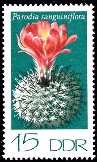 Auf dieser Marke aus der DDR (MiNr 1924) ist die Unterart Parodia microsperma subs. Sanguiniflora, auch bekannt als Parodia sanguiniflora, zu sehen. Michel beschreibt das Motiv mit "Igelkaktus (Porodia sanguiniflora)".