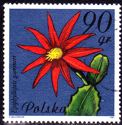 Auf einer Marke aus Polen (MiNr 2784) wird eine Blüte von Rhipsalidopsis gaertneri gezeigt.