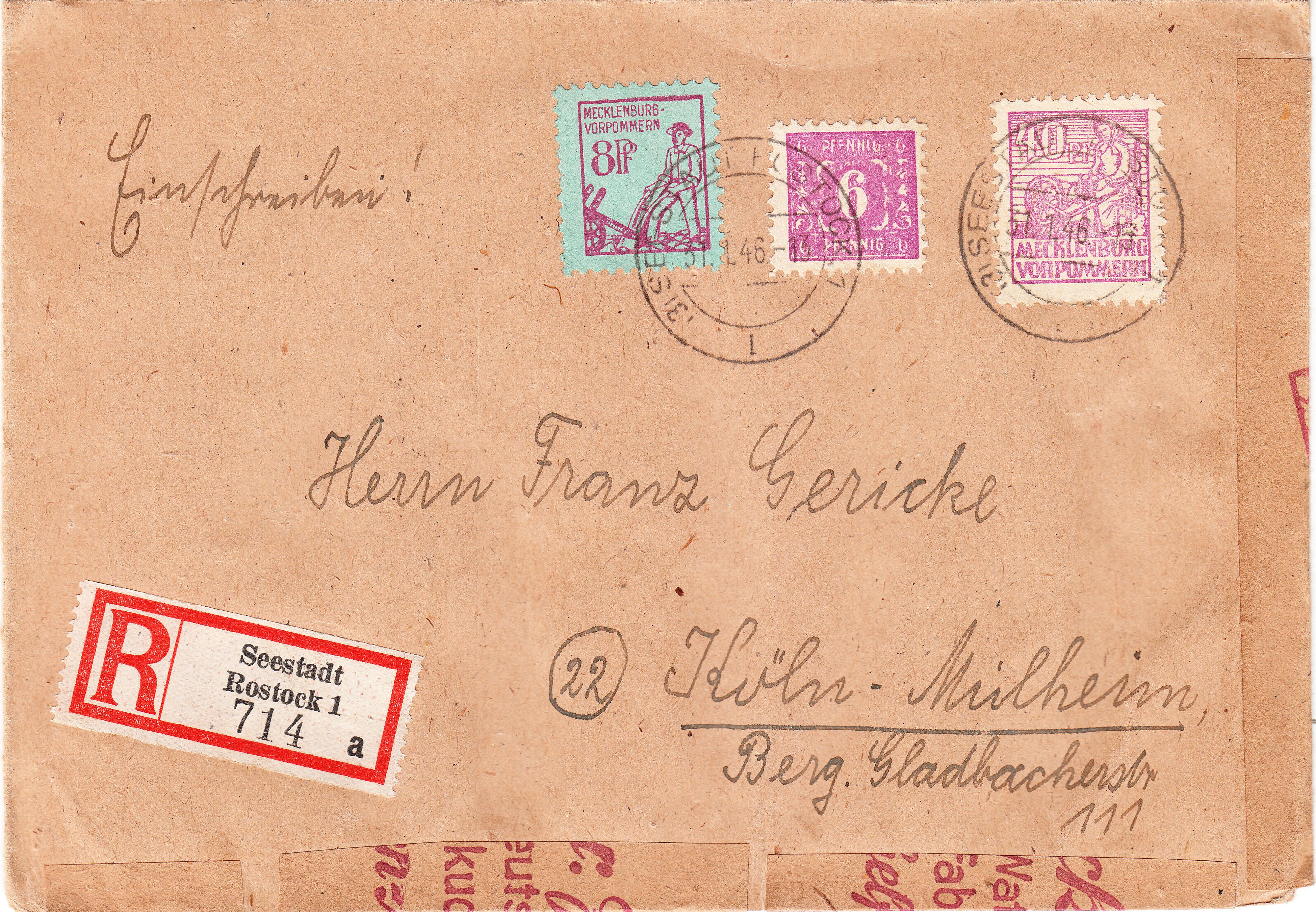 Hier eine MiNr. 40 ya in MiF, aufgegeben am 31.01.1946 in "Seestadt Rostock", portogerecht frankiert als Fernbrief der zweiten Gewichtsstufe (24 Pf) per Einschreiben (30 Pf), adressiert nach "Köln-Mülheim":