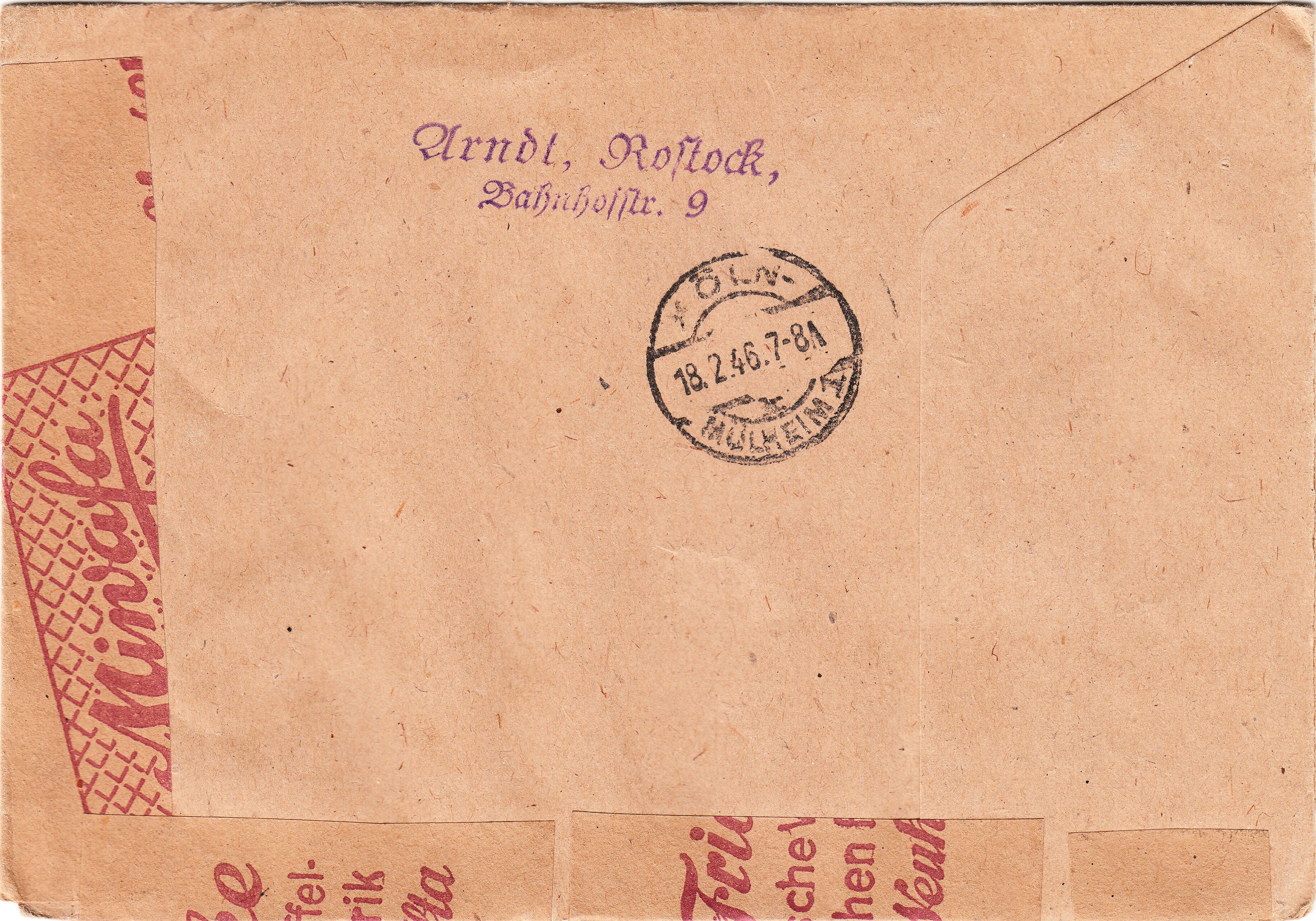 An seinem Bestimmungsort Köln-Mülheim kam dieser Beleg am 18.02.1946 an, was ein rückseitig abgeschlagener Tagesstempel dokumentiert:
