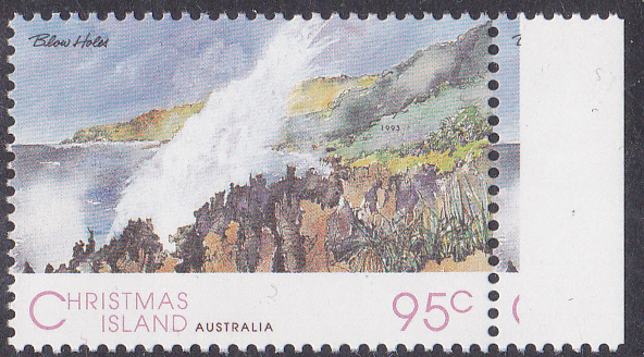 Die Marke zu 95 Cent (MiNr 385) zeigt "Blaslöcher" an der Küste der Weihnachtsinsel. Ein Blowhole (dt. Blasloch) ist eine enge Öffnung am Ende einer Meereshöhle, die über die Höhlendecke hinauf ins Freie reicht. Wenn eine Brandungswelle auf die Mündung der Höhle auftrifft, wird sie durch die Höhlenwände, wie in einem Trichter, zum Blowhole geführt, was bei geeigneter Geometrie der Höhle und den richtigen Wetterbedingungen zu spektakulären Wasserfontänen führt.