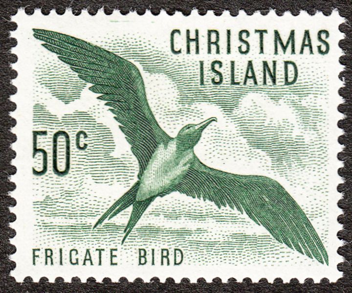 Der auf diesem Postwertzeichen dargestellte Weißbauch-Fregattvogel (Fregata andrewsi) ist ein seltener Seevogel, der sein Brutgebiet auf der Weihnachtsinsel hat. In der Roten Liste gefährdeter Arten der IUCN wird die Art in der Kategorie „vom Aussterben bedroht“ (critically endangered) gelistet. Die IUCN schätzt den Bestand auf derzeit 2.400 bis 4.800 geschlechtsreife Individuen.