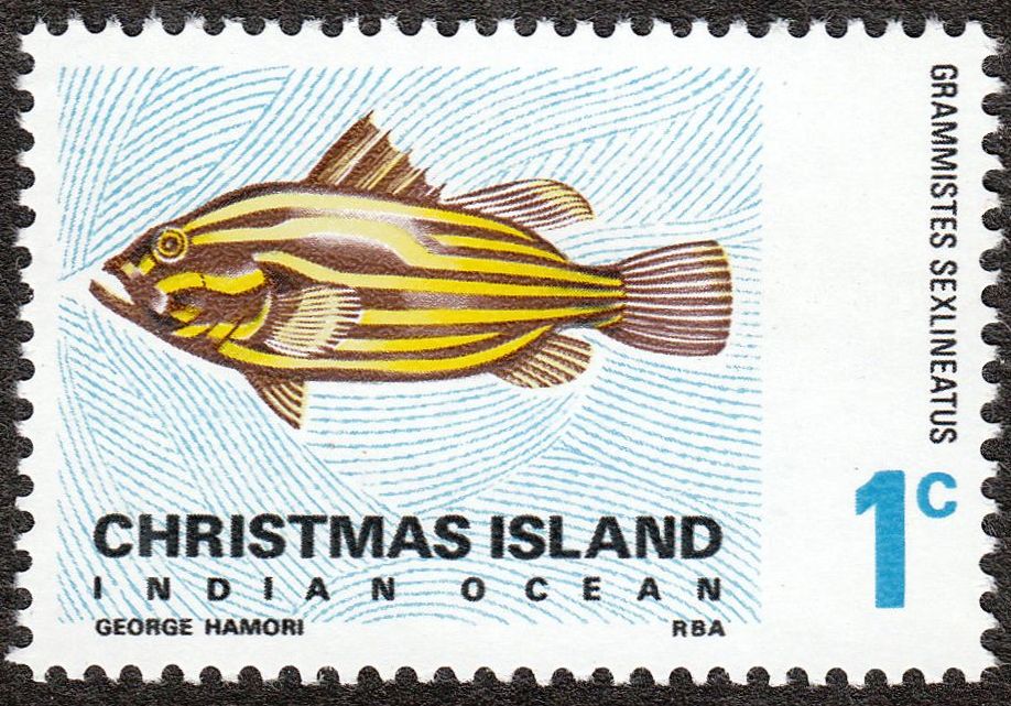 Hier die MiNr. 22, die einen Goldstreifen-Zackenbarsch = Grammistes sexlineatus zeigt: