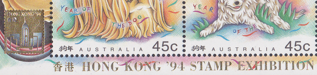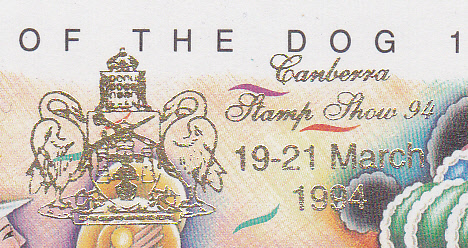 Diesen Block gibt es auch mit Aufdruck eines Hundes und "Melbourne STAMP & Coin Show 11-13 February 1994" (MiNr Block 8 I)