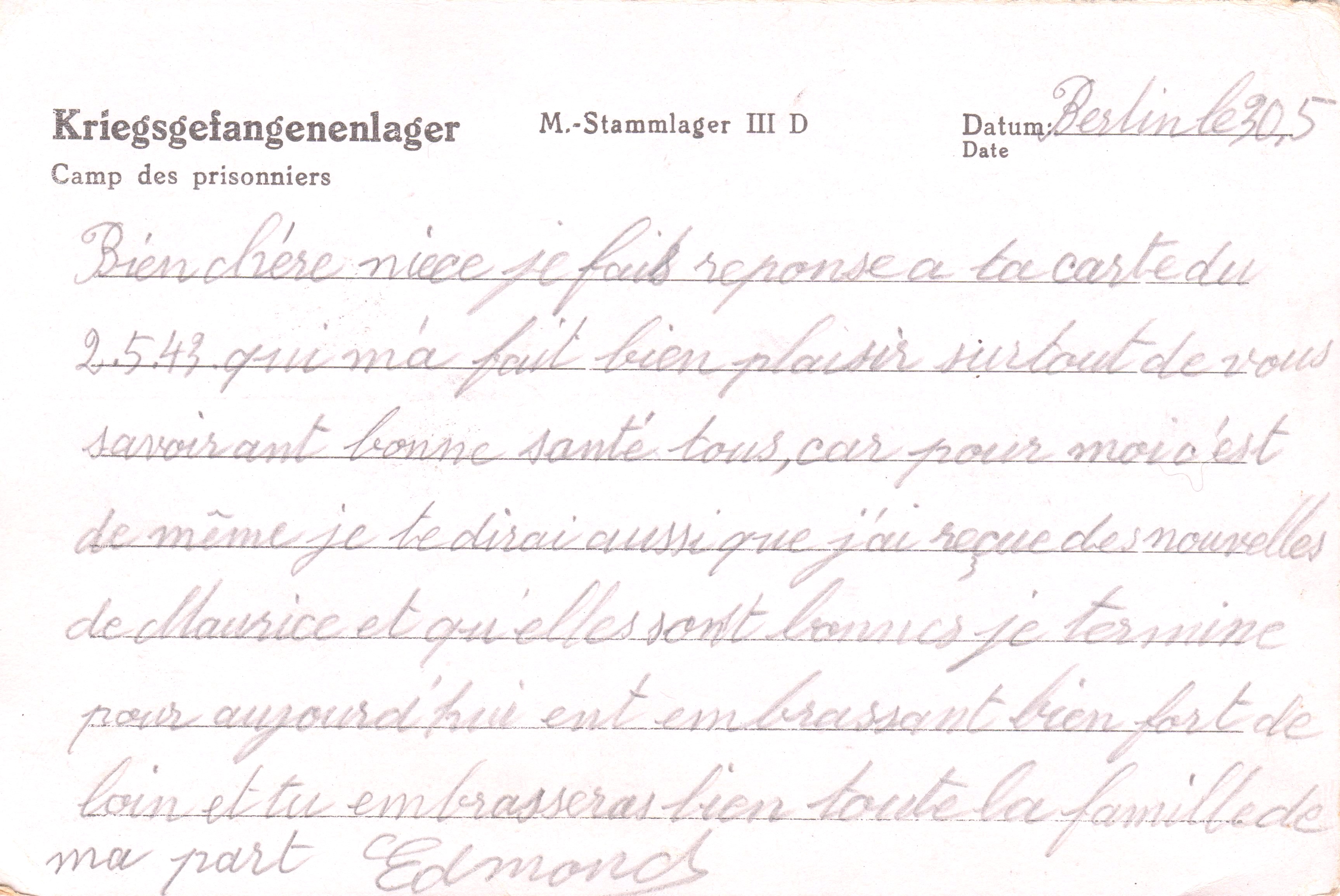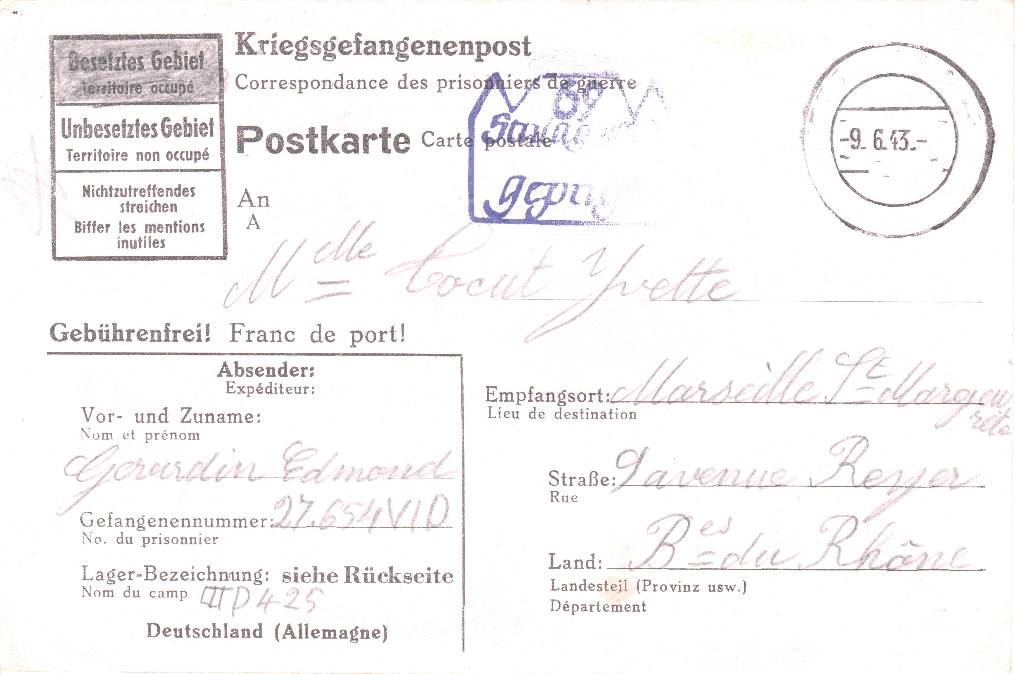 Vordruck Kriegsgefangenenpost Postkarte "M.-Stammlager III D", beschrieben am 30.05.1942 mit handschriftlicher Lagerbezeichnung "III D 425", Prüferstempel "69" sowie stummem Tagesstempel "-9. 6.43.-":