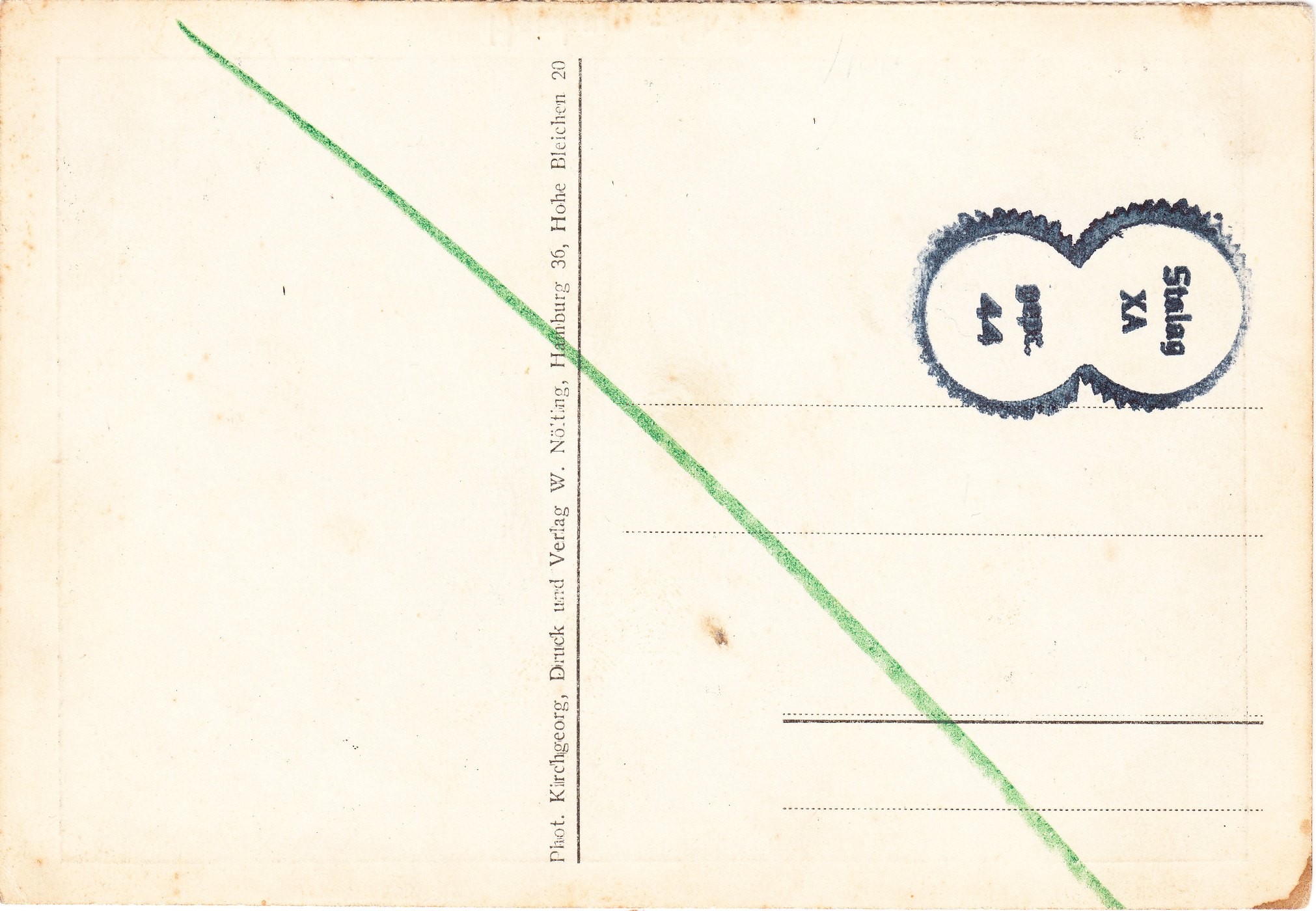 Sie wurde einem Brief beigelegt, der vom Stalag XA aus Schleswig verschickt wurde. Der dortige Prüfer "44" benutzte diesen Prüferstempel in ganz individueller Form und "entwertete" die Adreßseite der Ansichtskarte mit einem diagonalen Strich per Grünstift: