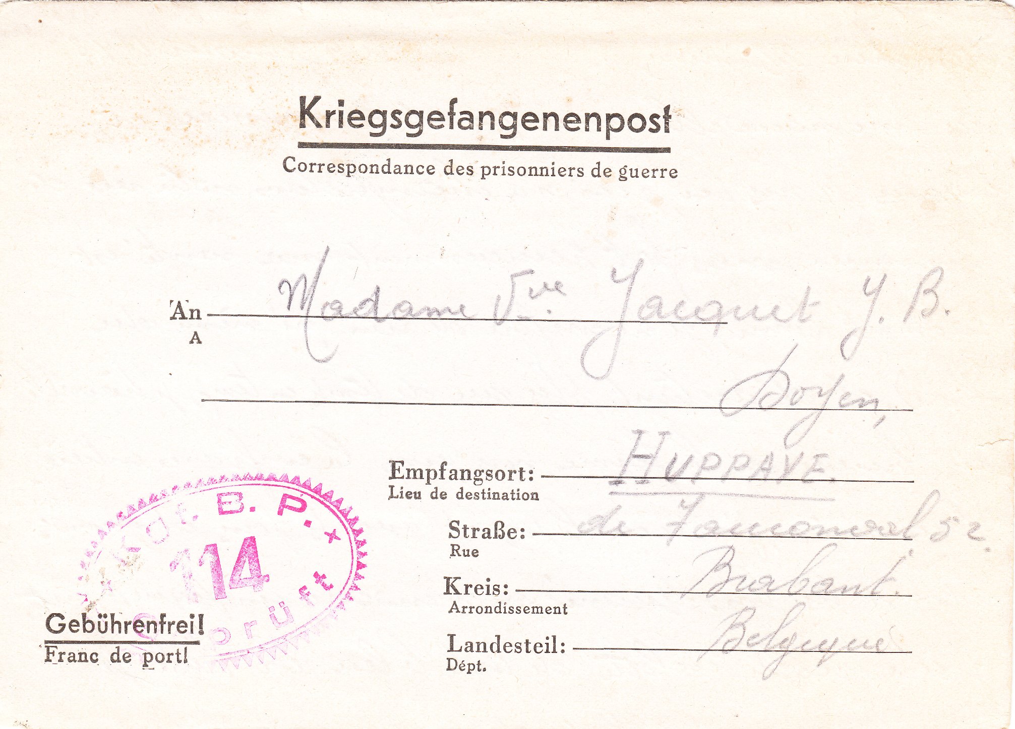 Er trägt einen Briefstempel "Kriegsgef. Mannsch. Stalag Stalack", wurde also im Stalag I A in Stalack aufgegeben: