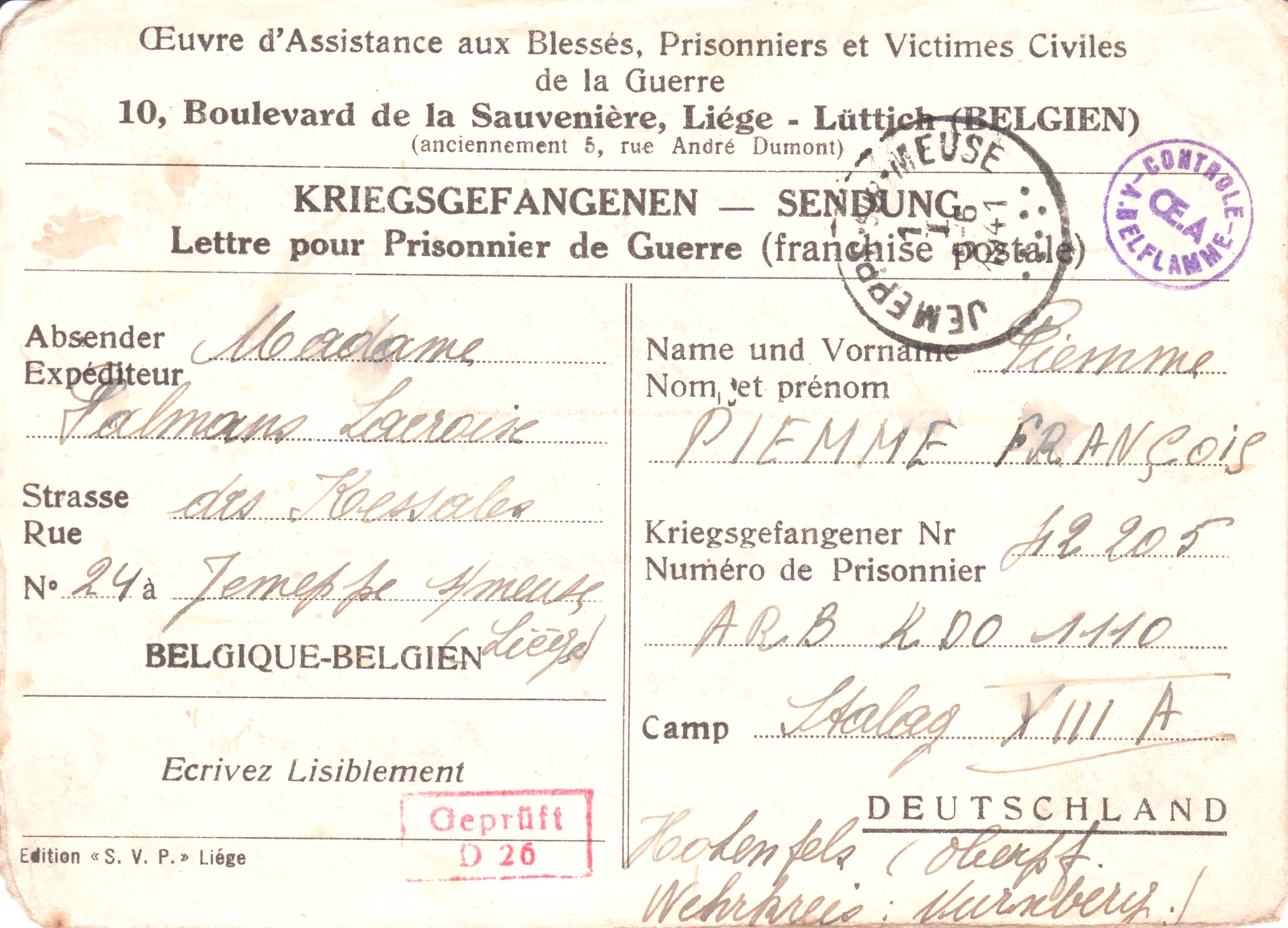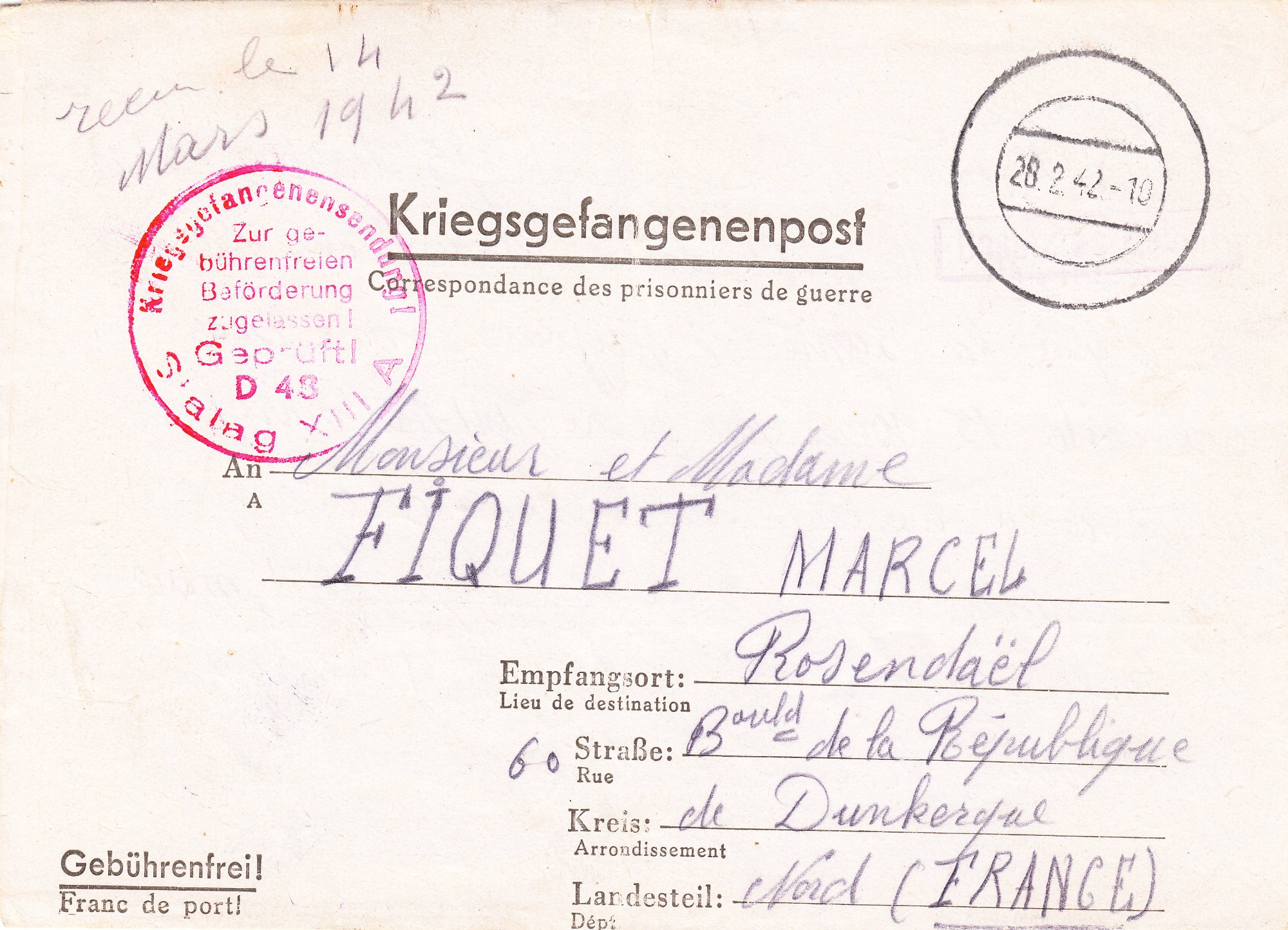 Dieser Faltbrief mit rückseitigem Eindruck "M-Stammlager XIII A" wurde am 28.02.1942 ab dem in Sulzbach-Rosenberg stationierten Stalag XIII A verschickt: