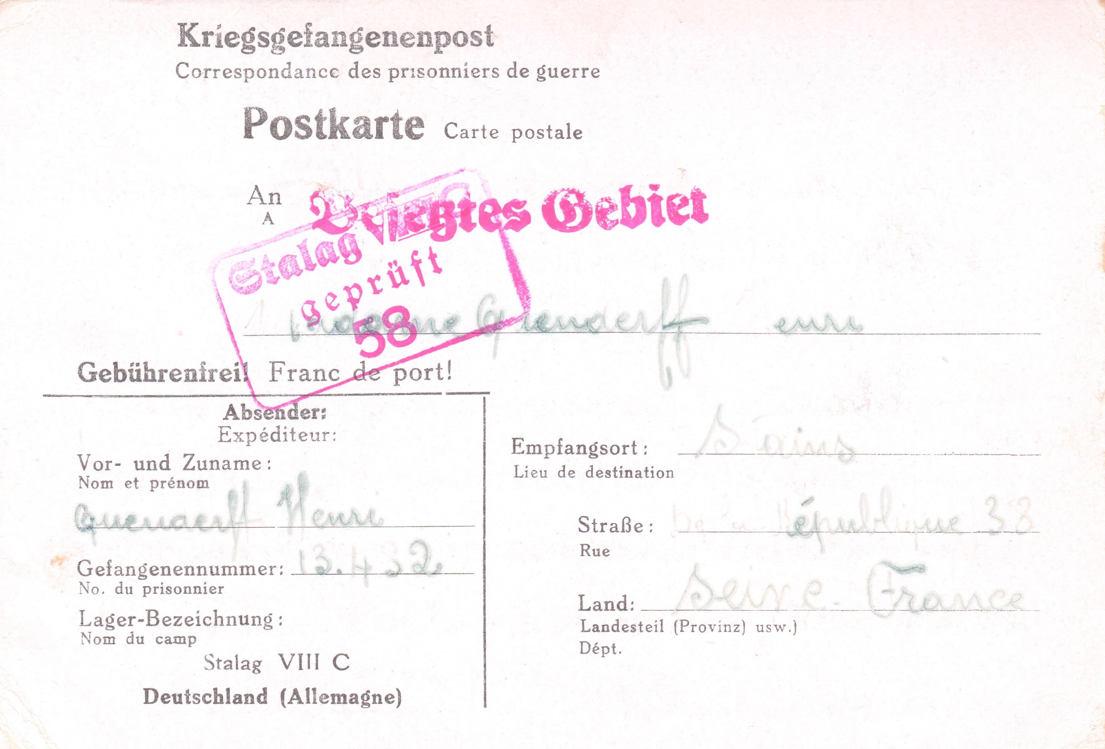 Postkartenvordruck von Stalag VIII C in Sagan, geschrieben am 11.05.1942, mit Prüferstempel "Stalag VIII C geprüft 15", gelaufen nach Frankreich: