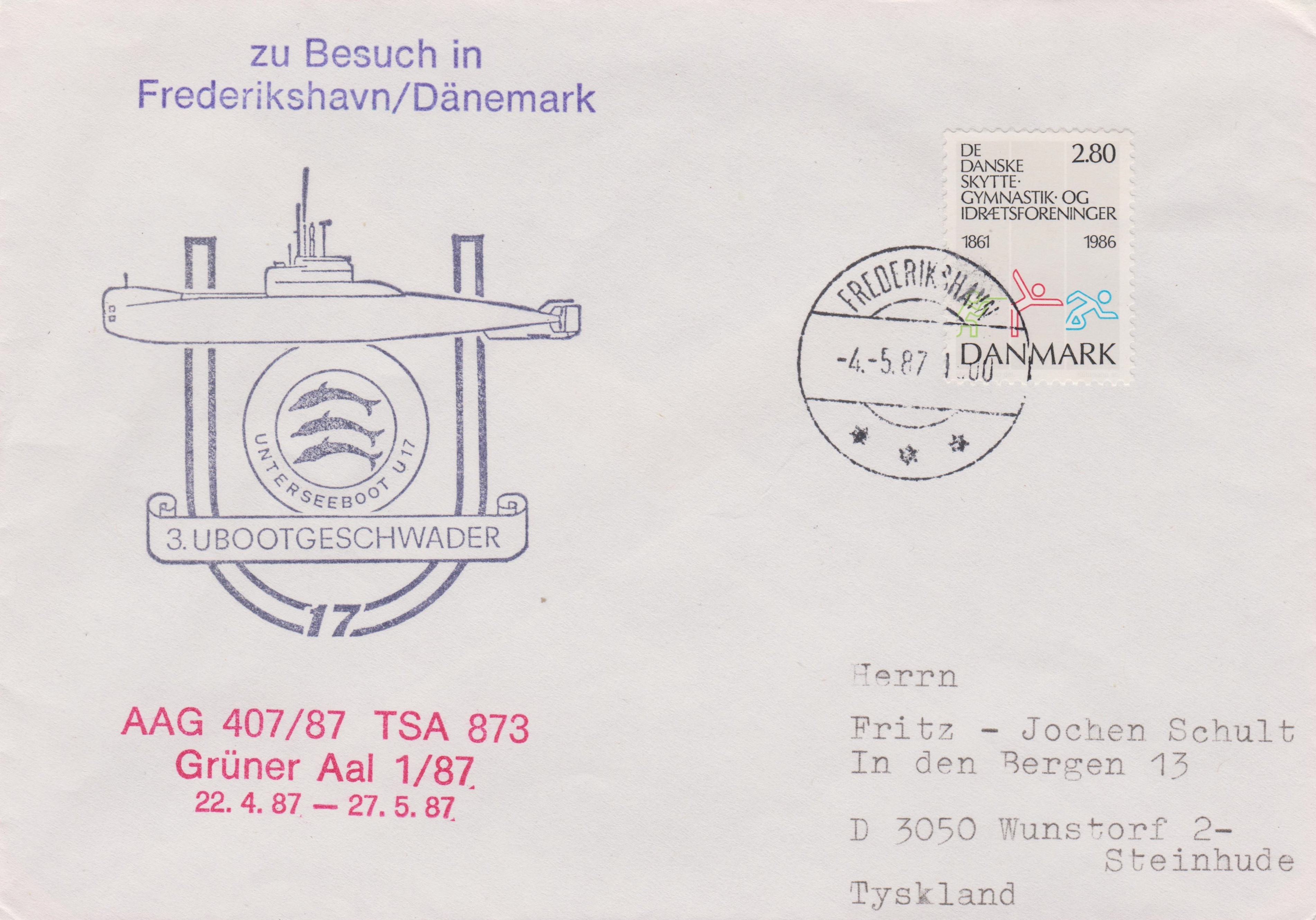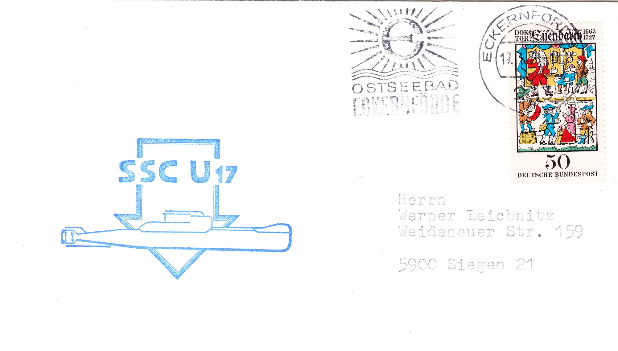 Hier ein Beleg mit blauem Cachetstempel, aufgegeben im Heimathafen Eckernförde am 17.01.1978: