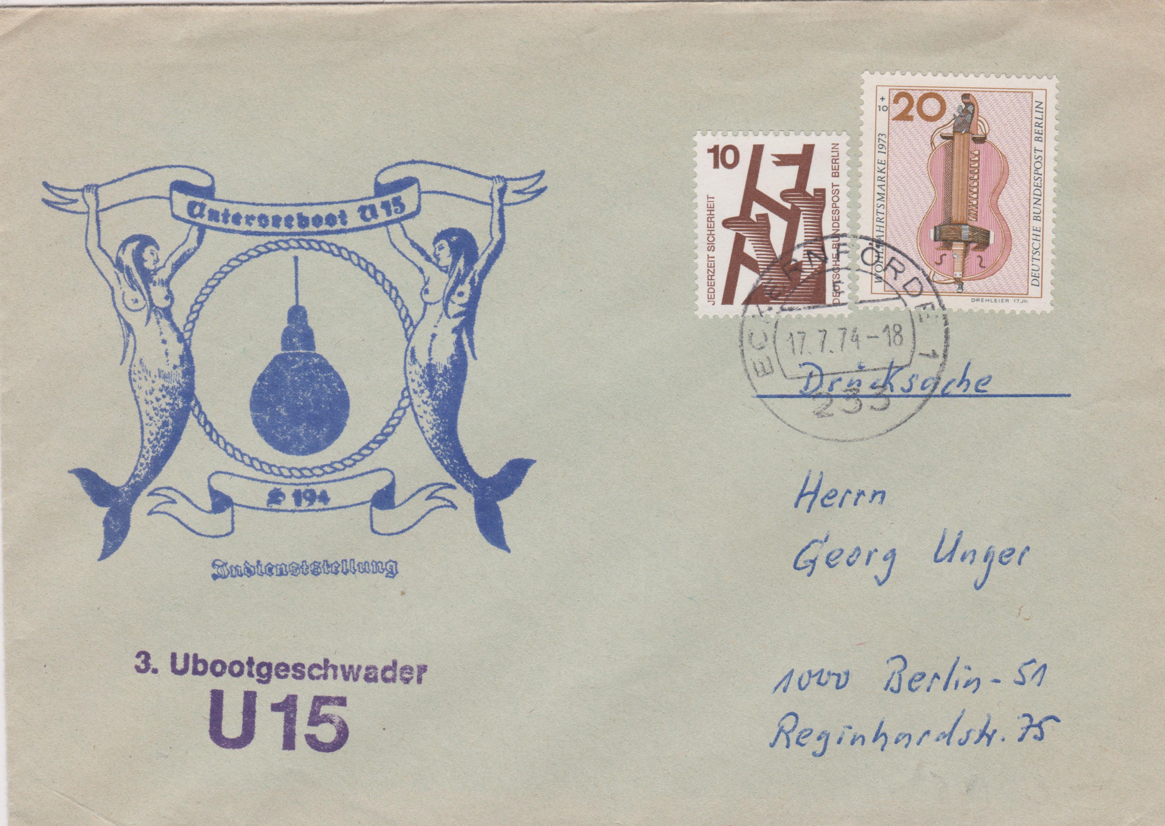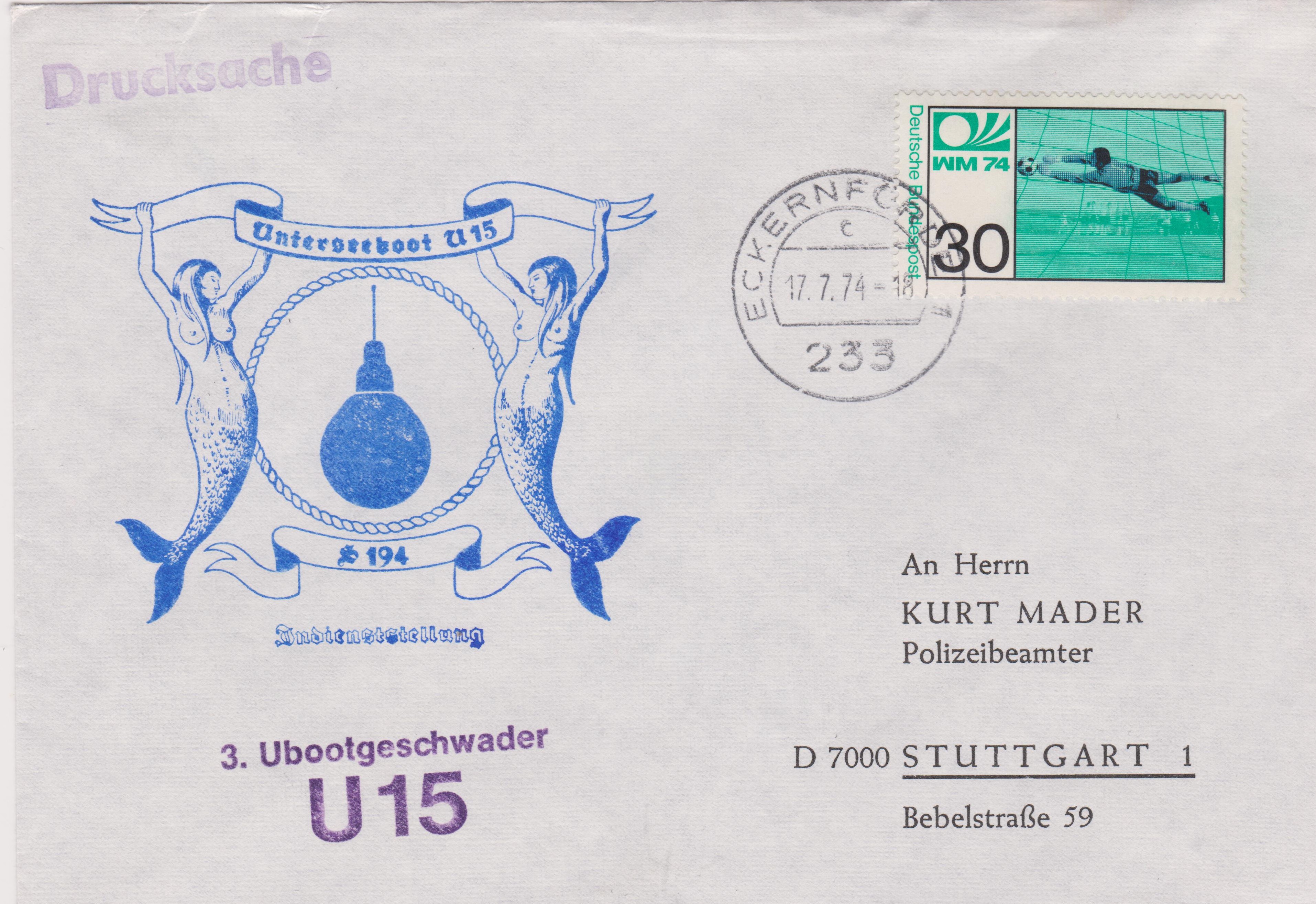 Dieser Beleg dokumentiert die Indienststellung von U 15 beim 3. Ubootgeschwader am 17.07.1974: