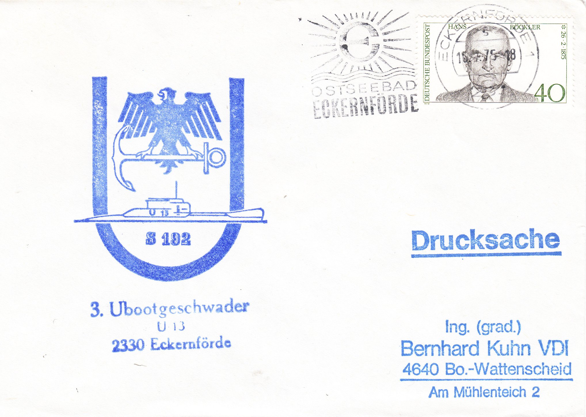 Dieser Beleg trägt einen Cachetstempel in Blau und wurde am 15.07.1975 im Heimathafen Eckernförde der Post zur Weiterbeförderung übergeben, die die Frankatur mit einem Tagesstempel entwertete: