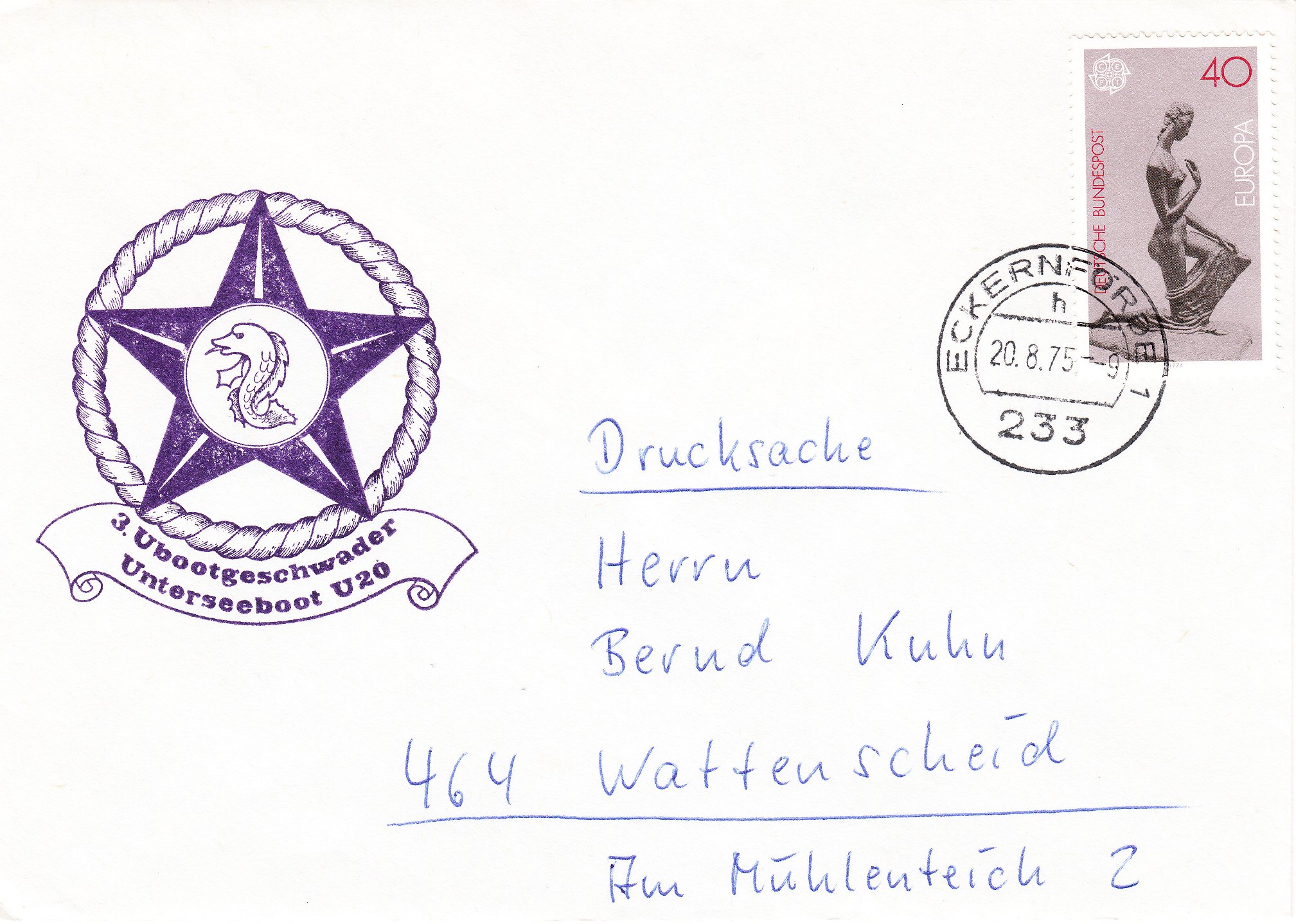 Dieser Beleg trägt einen Cachetstempel in Violett und wurde am 20.08.1975 im Heimathafen Eckernförde der Post zur Weiterbeförderung übergeben, die die Frankatur mit einem Tagesstempel entwertete: