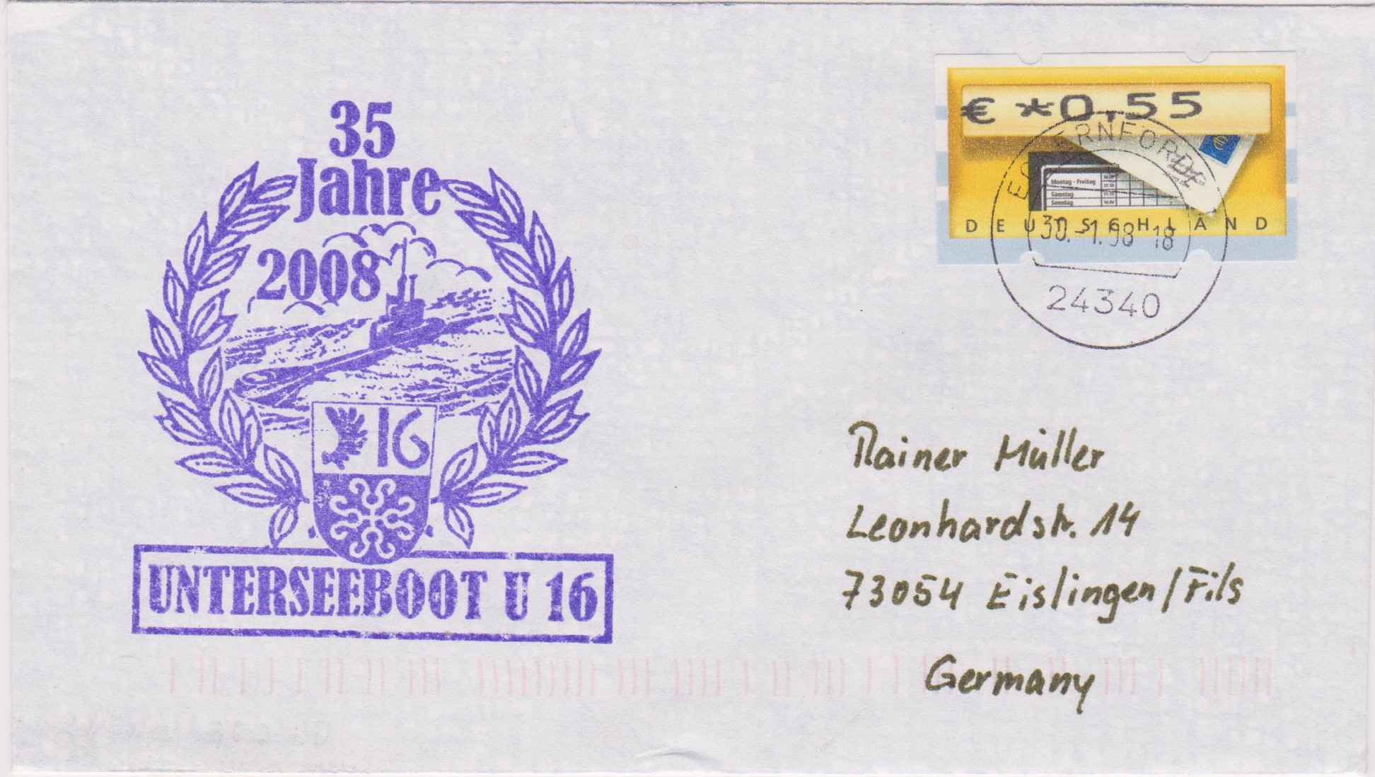 Das am 09.11.1973 in Dienst gestellte U-Boot "U 16" der U-Boot-Klasse 206 gehörte zum 3. Ubootgeschwader in Eckernförde, was dieser Beleg vom 22.01.1974 dokumentiert: