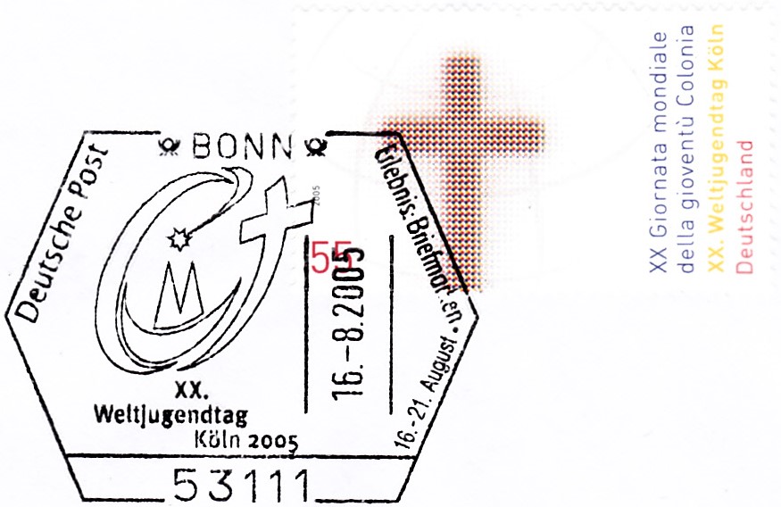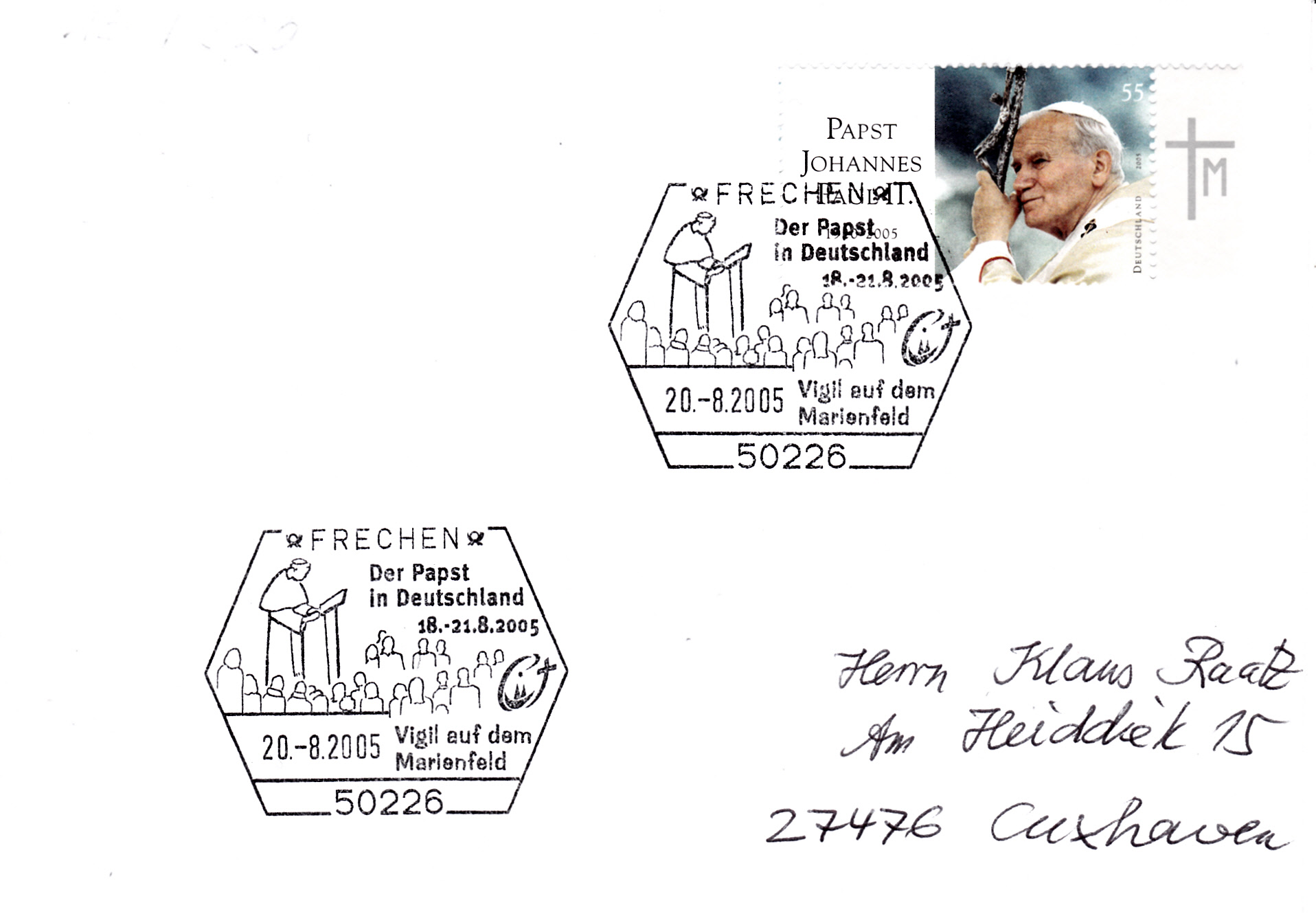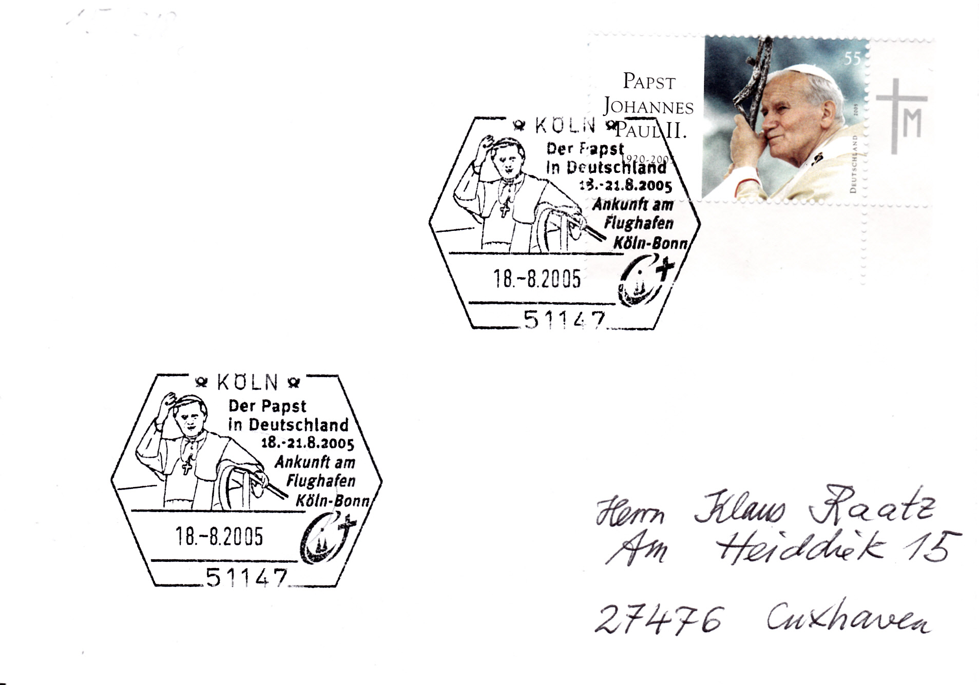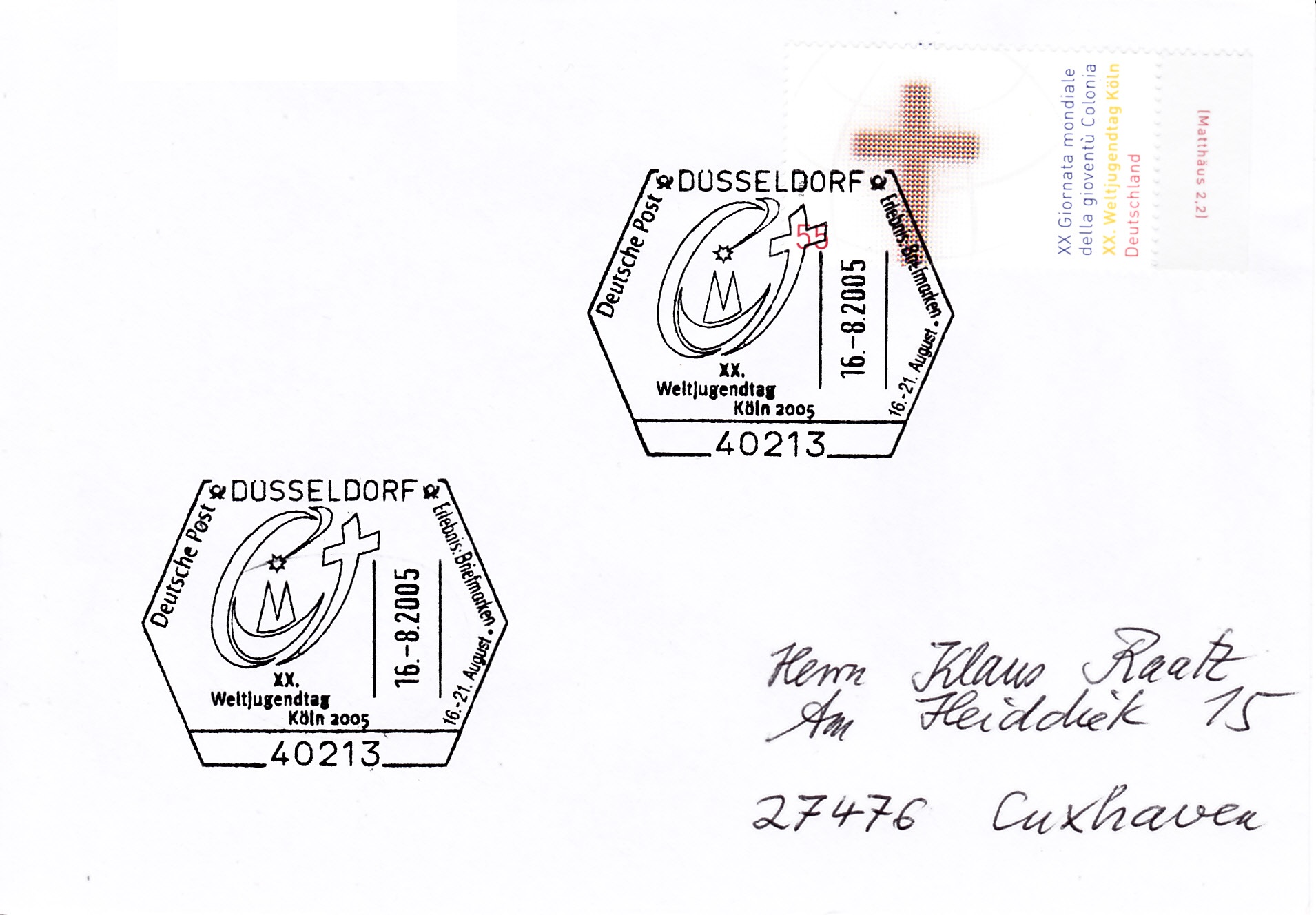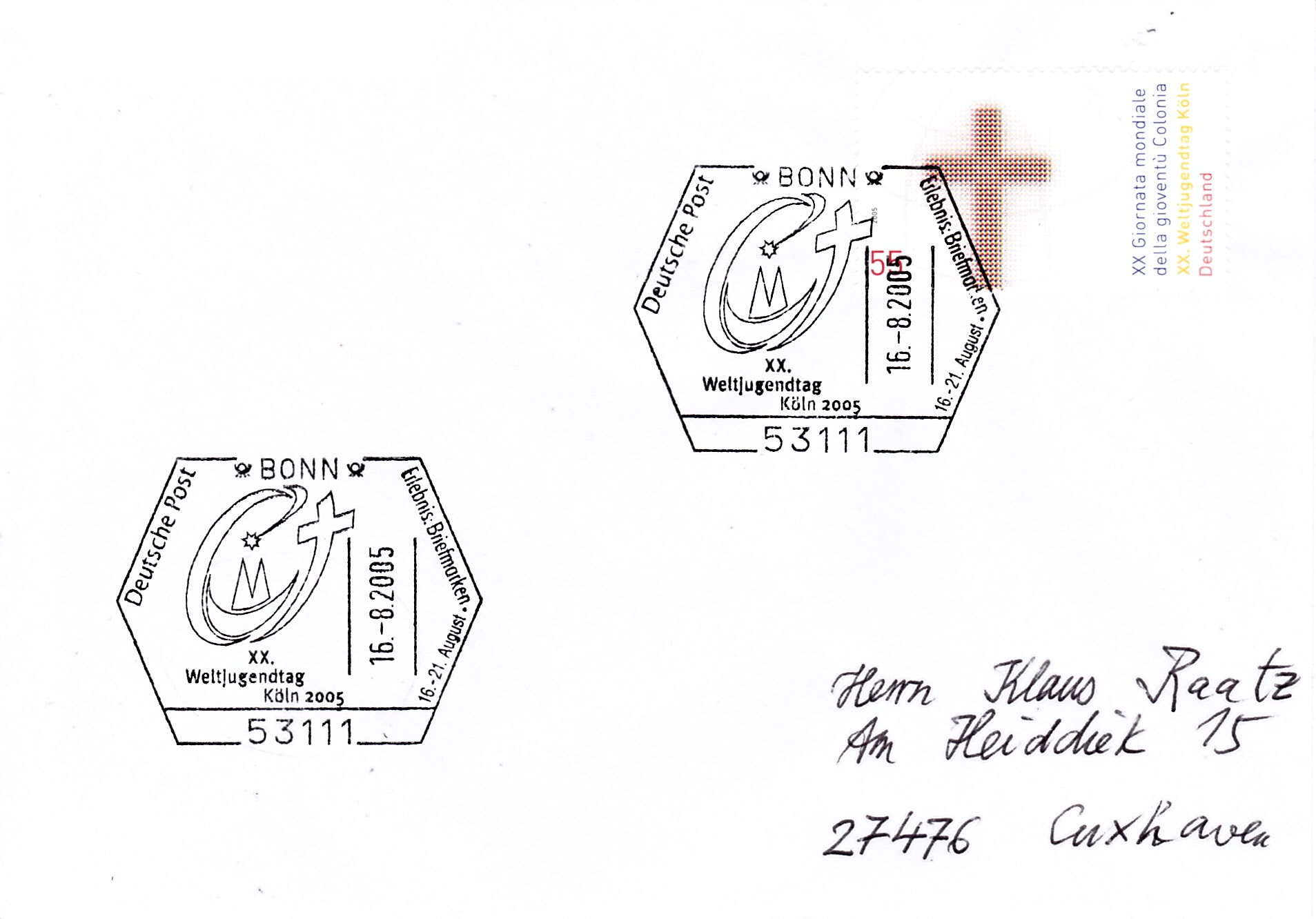 Dazu zeige ich hier den Sonderstempel aus Köln vom 16.8.2005 auf einem Brief nach Cuxhaven. Als Frankatur wurde passend die Marken zum Weltjugendtag (MiNr 2469) verwendet.