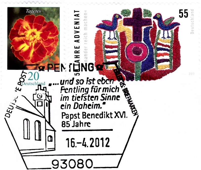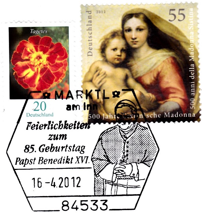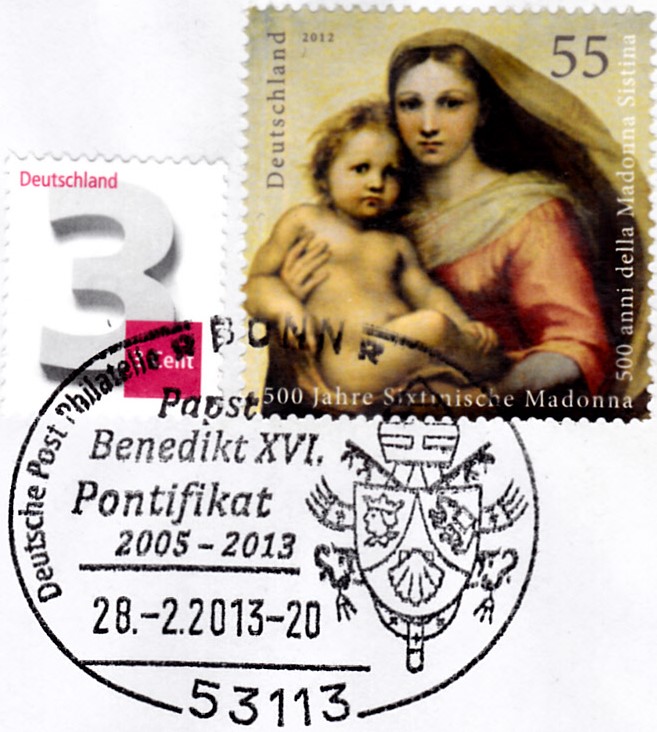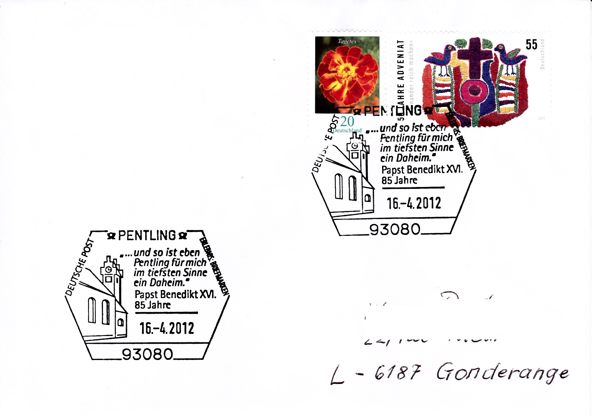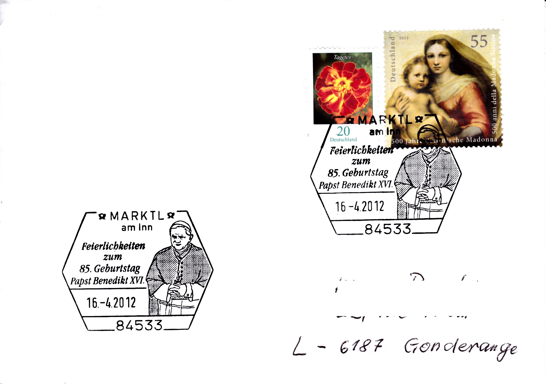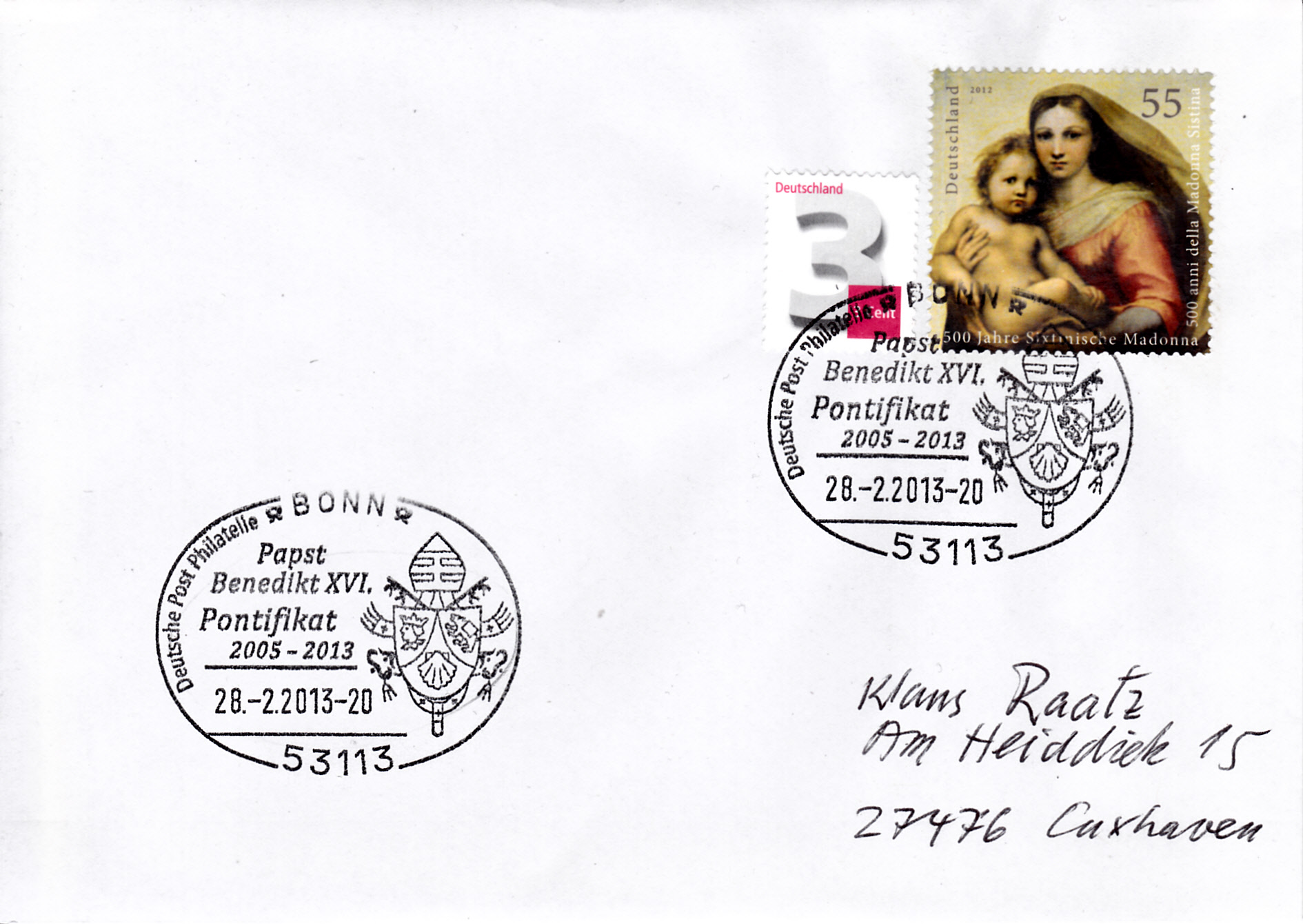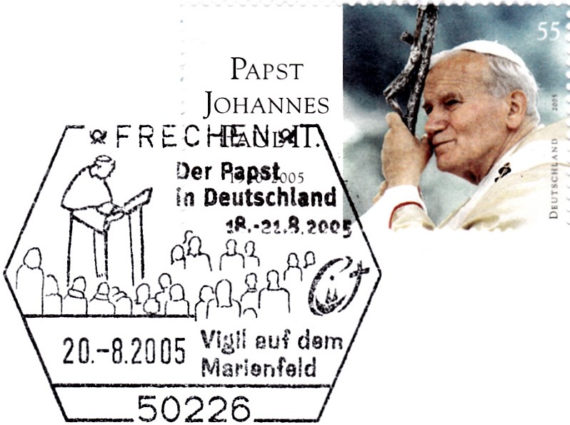Dazu zeige ich hier den Sonderstempel aus Köln vom 16.8.2005 auf einem Brief nach Cuxhaven. Als Frankatur wurde passend die Marken zum Weltjugendtag (MiNr 2469) verwendet.