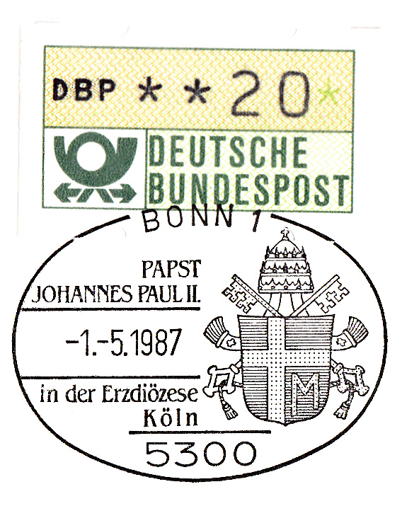 Sonderstempel vom 1.5.1987 aus Bonn zum Besuch des Papstes Johannes Paul II in der Erzdiözese Köln. Im Stempelbild das Wappen von Johannes Paul II.