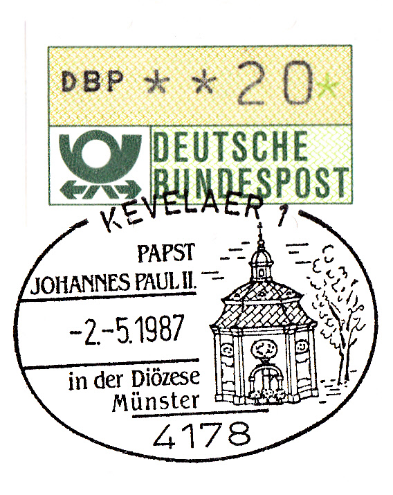 Sonderstempel aus Kevelaer vom 2.5.1987 zum Besuch des Papstes Johannes Paul II in der Diözese Münster. Im Stempelbild wird die Gnadenkapelle in Kevelaer abgebildet.