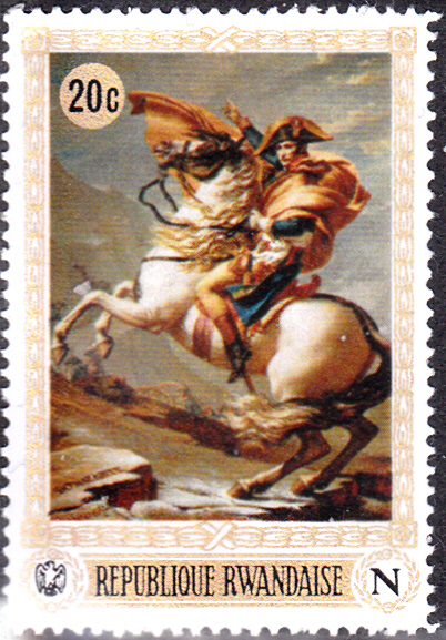 Zum 200. Geburtstag von Napoleon I. ist in Ruanda diese Marke (MiNr 351 A) mit dem Gemälde "Napoleons Überquerung des großen St. Bernhard" von Jaques Louis David (1748-1825) erschienen.