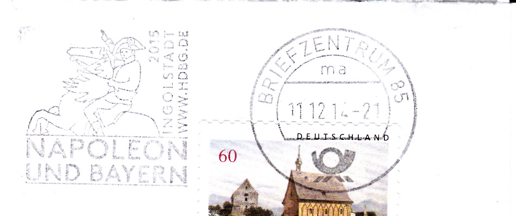 Der Maschinenwerbestempel des Briefzentrum 85 wirbt für die Bayerische Landesausstellung 2015 in Ingolstadt zum Thema Napoleon und Bayern aus Anlass 200 Jahre Niederlage Napoleons bei Waterloo 1815 und seiner endgültigen Abdankung und seiner Verbannung nach St. Helena. Im Bild ist Napoleon Bonaparte beim Überschreiten der Alpen am Großen Sankt Bernhard nach einem Detail aus dem Gemälde von Jacques-Louis David (1800) zu sehen.